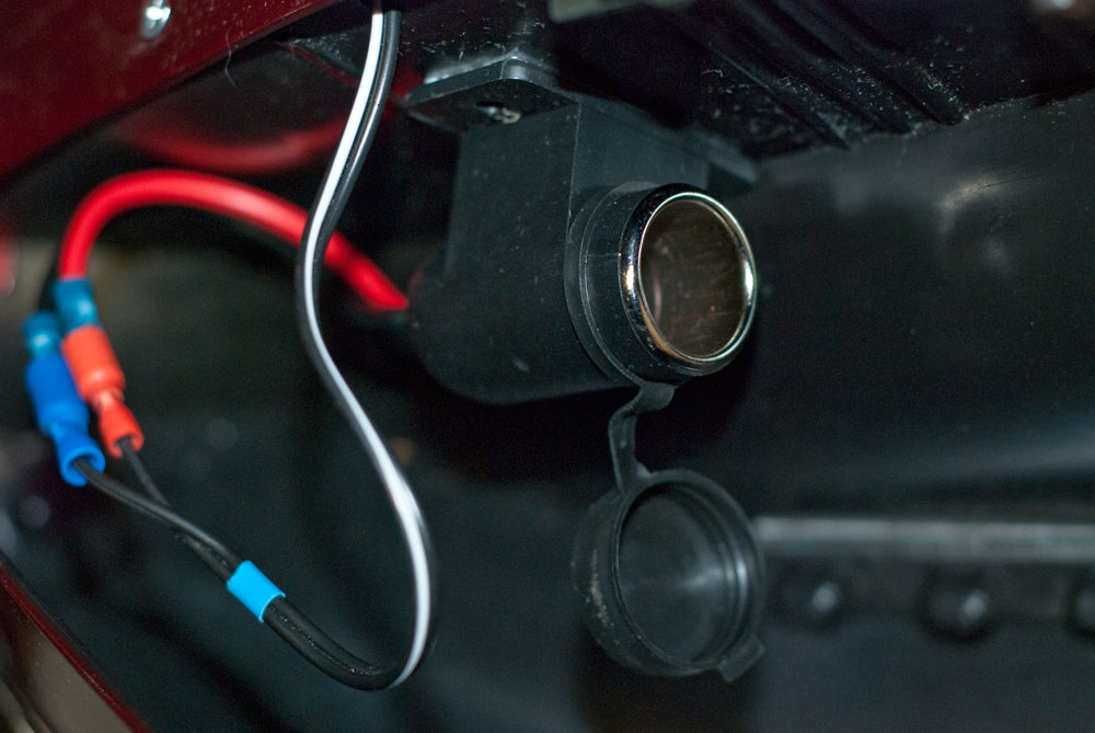 Plak of schroef het "sigarettenaansteker" contact vast aan de binnenzijde van de berguimte. Een stukje montagetape met foamlaag doet wonderen. Het zit als een huis zonder te hoeven boren, schroeven of lijmen.