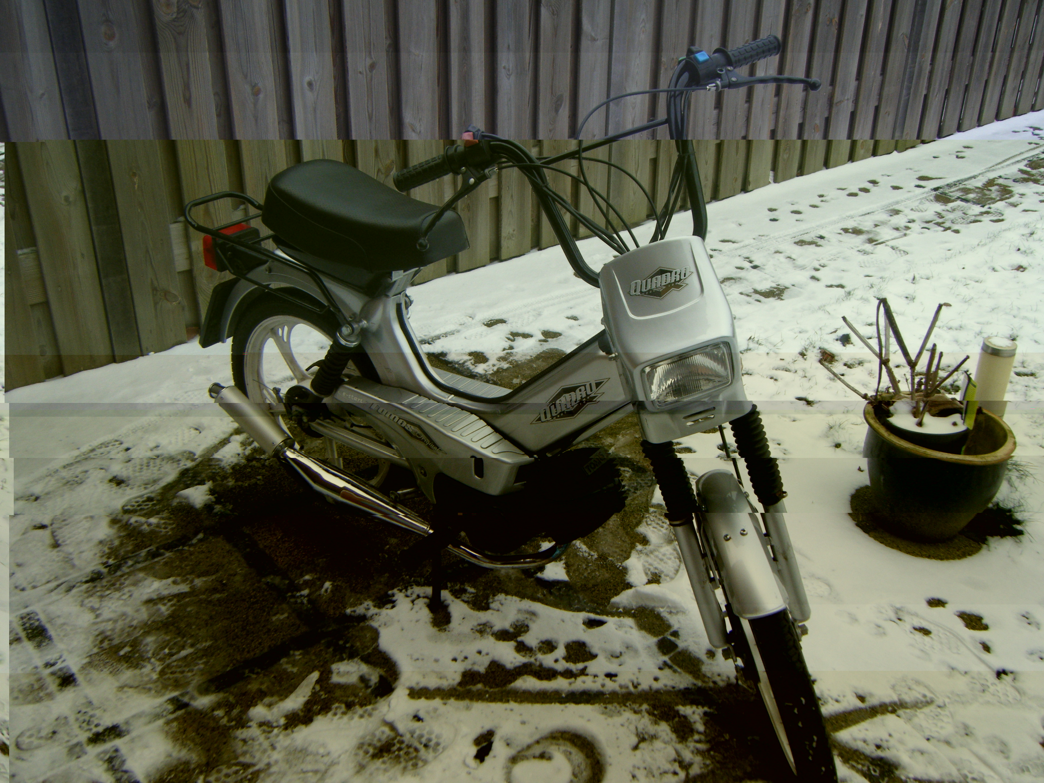 Dit is mijn Tomos Quadro e-start snor uit 2005. Ik had hem gekocht voor 450 euro. En hij reed 45 km per uur.