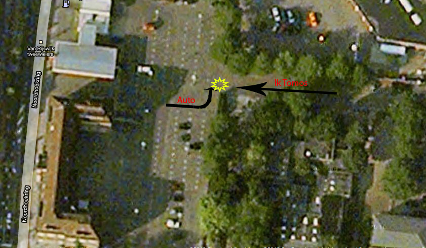 Ik wilde naar school rijden, dus ik rijd een klein weggetje op die uitkomt bij een parkeerplaats, met een vaartje van ongeveer 25 km/u. Opeens vlak voordat ik het parkeerterrein op wil rijden komt er een auto achter een heg vandaan van links en ik ga dus vol in de remmen maar kan niet voorkomen dat ik met mijn voorkant tegen de zijkant van de groene renault twingo aanknal. Bij mij is de voorvork krom, en de band is lek, bij haar een minimale deuk. Wie zit er nu fout?