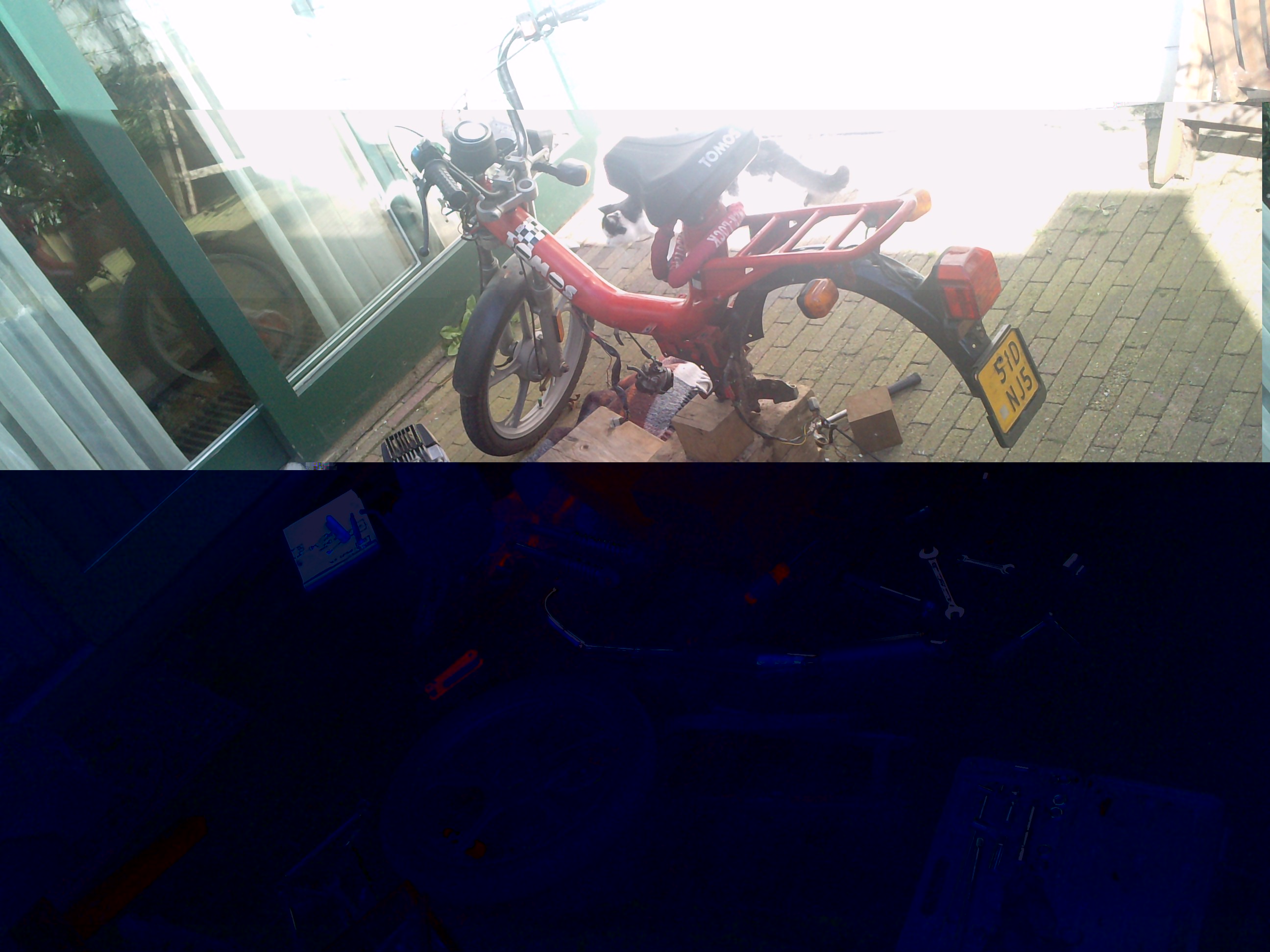 op een dag was ik die lelijke kleur dof en verkleurd rood door al die benzine die erover heen was gegaan beu, en toen dacht ik laat ik hem maar eens laten spuiten dus ik een spuiterij voor niks geregeld en hopata, toen kon het werk pas echt beginnen. dus ik begon met het uit elkaar halen met een maat van mij.