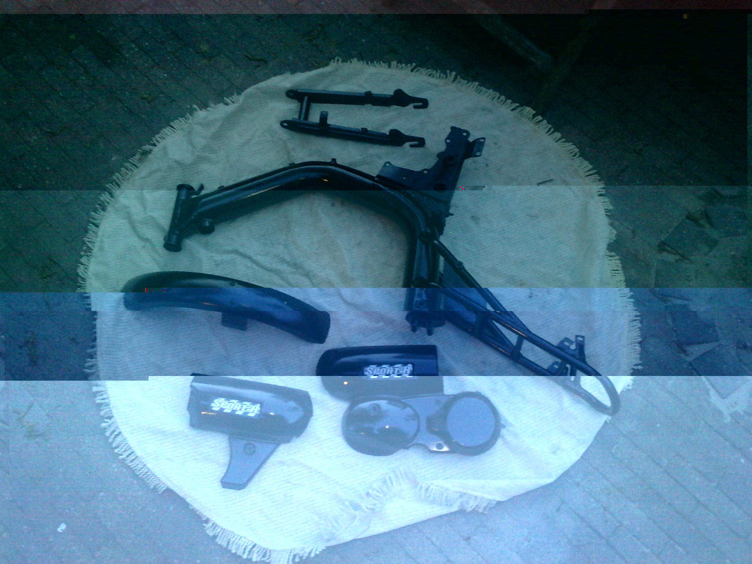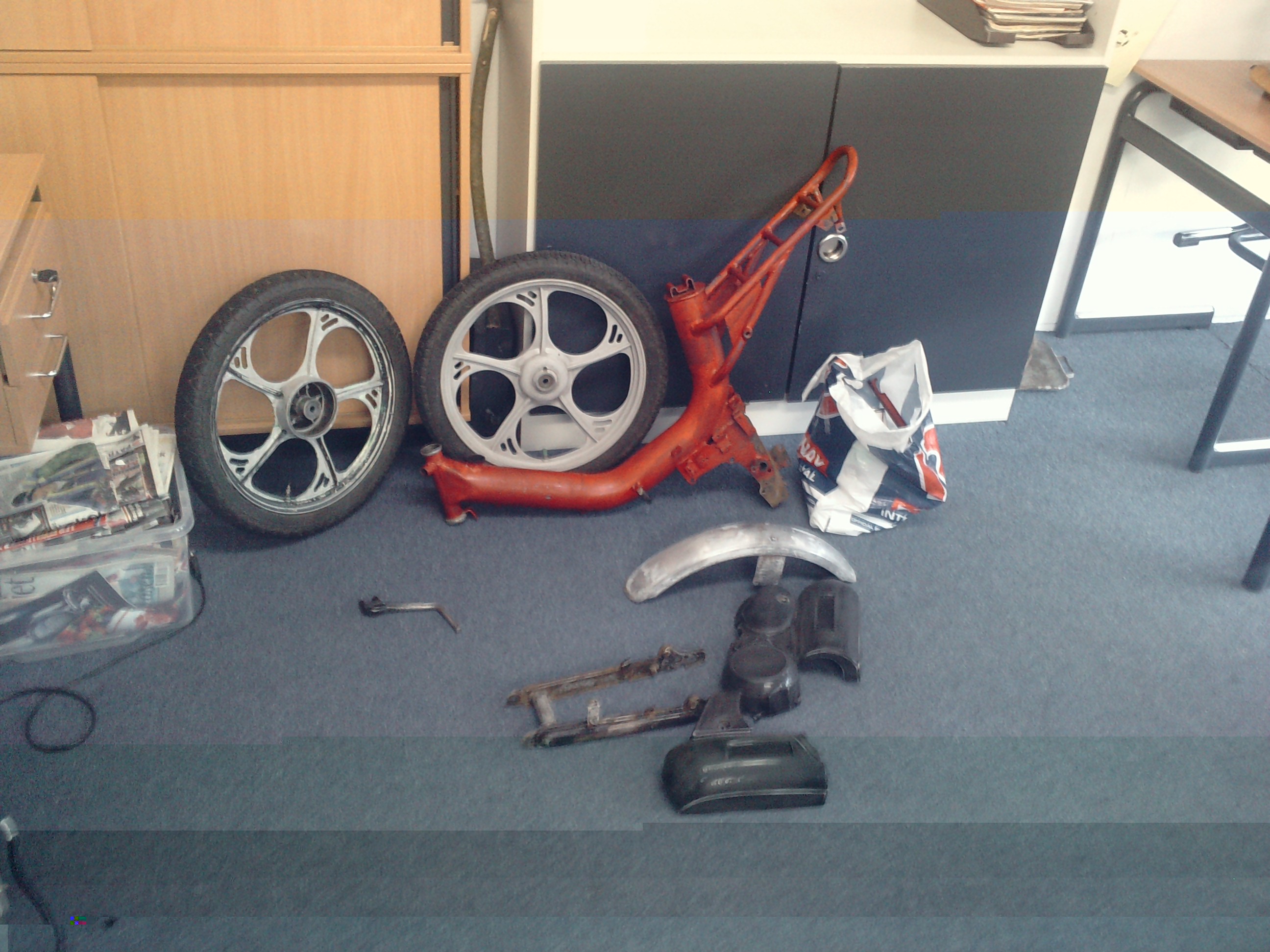 en nou ligt hij helemaal uit elkaar, en gechuurd en wel (mede dankzij 2 andere maten van mij) zijn de onderdelen die gespoten moeten worden op school onderweg naar de spuiterij.
