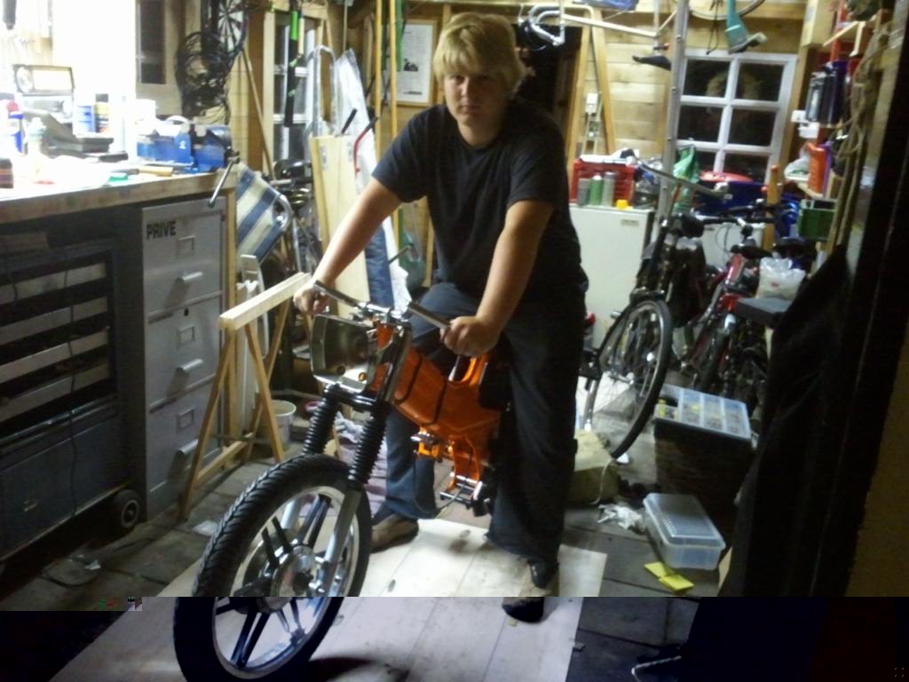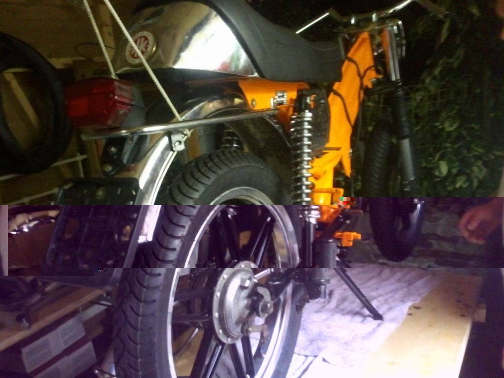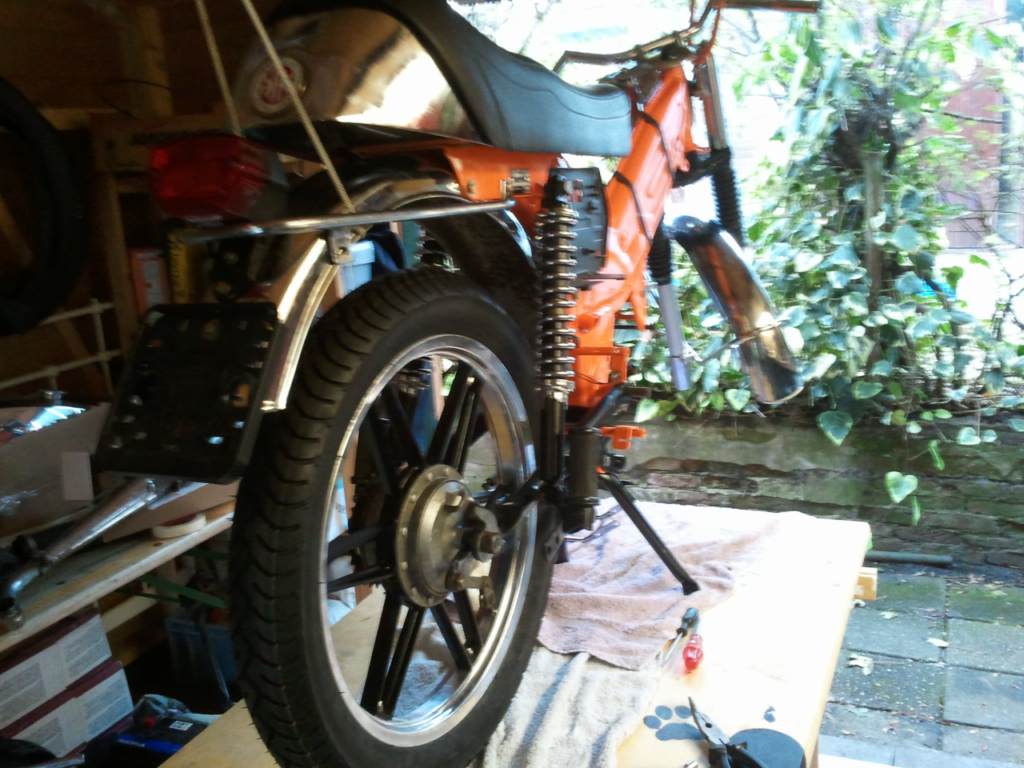 Voorvork heb ik gereviseerd volgens het boekje en in theorie zou deze nu weer gewoon goed moeten veren.. alleen toen ik hem van de tafel afhaalde en op de grond zette veerde 'ie maar heel weinig tot niet.. Ook had ik een, volgens de verkoper, een zgan standaard gekocht en nu deze gemonteerd is lijkt de standaard wel doorgezakt te zijn.. Ik ga kijken of ik nog kan achterhalen van wie ik deze heb gekocht Ook had ik opnieuw verchroomde spatbordbeugels gekocht alleen heeft hij mij de verkeerde toegestuurd en gaat dat ook weer lang duren.. Spullen van KP zijn ook nog niet binnen..