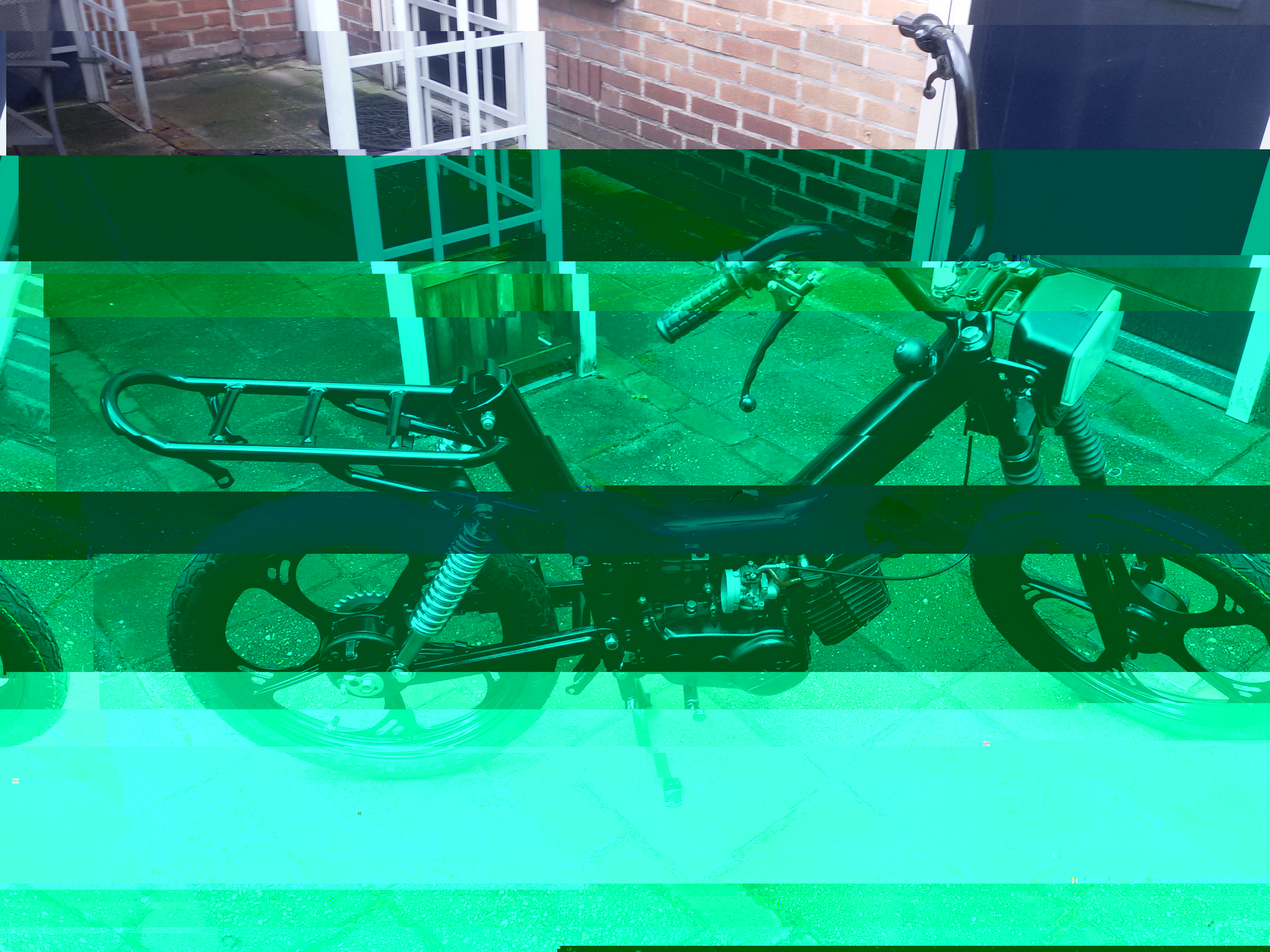 Zoals te zien moeten de kappen nog worden gespoten, dit ga ik doen zodra de temperatuur weet wat hoger is in het voorjaar. Ook moet ik nog iets van zwart rubber vinden voor de bevestiging van het zadel (nu stukjes tuinslang gebruikt) om de poedercoating niet te beschadigen.
