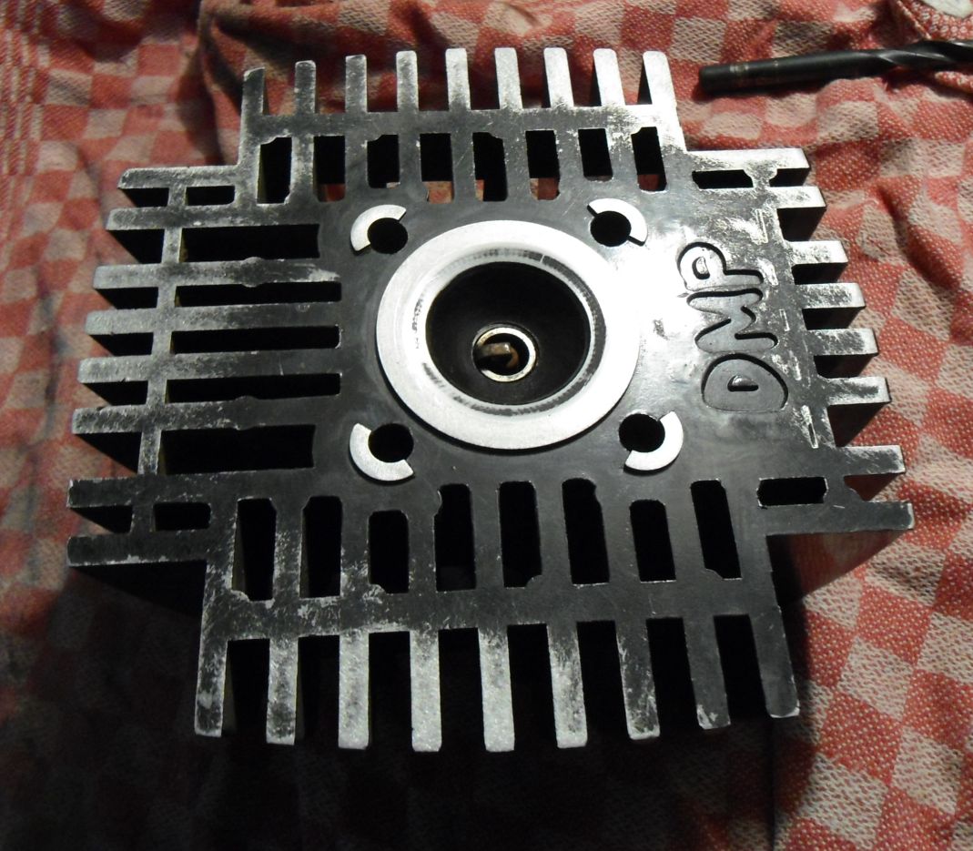Met meteen ideetje van het aanpassen van de kop er bij zodat er een wat dikkere voetpakking onder kon. Dat ging eigenlijk prima, gekozen voor de 65 cc kop van DMP omdat daar minder matriaal vanaf moet omdat ik geen draaibank heb maar wel een schuurmuis :) Zou DMP echter niet wezen als er geen verschil in die koppen zit kwam ik achter. |Als je hem helemaal vlakt dan is ie kleiner als 38mm en dat scheelt nogal of je de ene kop of de andere hebt, DOH! Enfin, bougie in de kop gedraaid, die in de boormachine en met een fijn schuurpapiertje bewerkt en verrek, dat ging perfect!