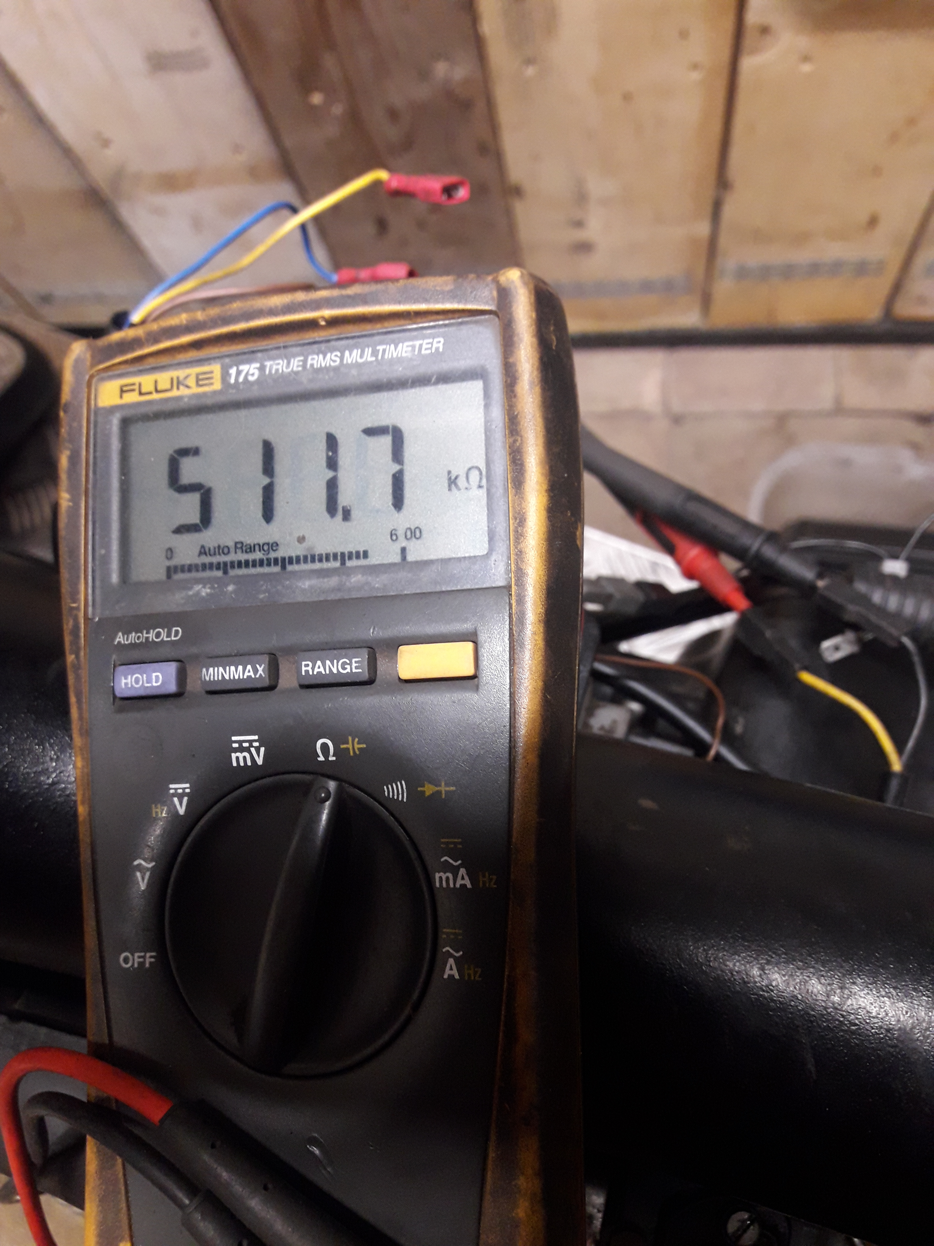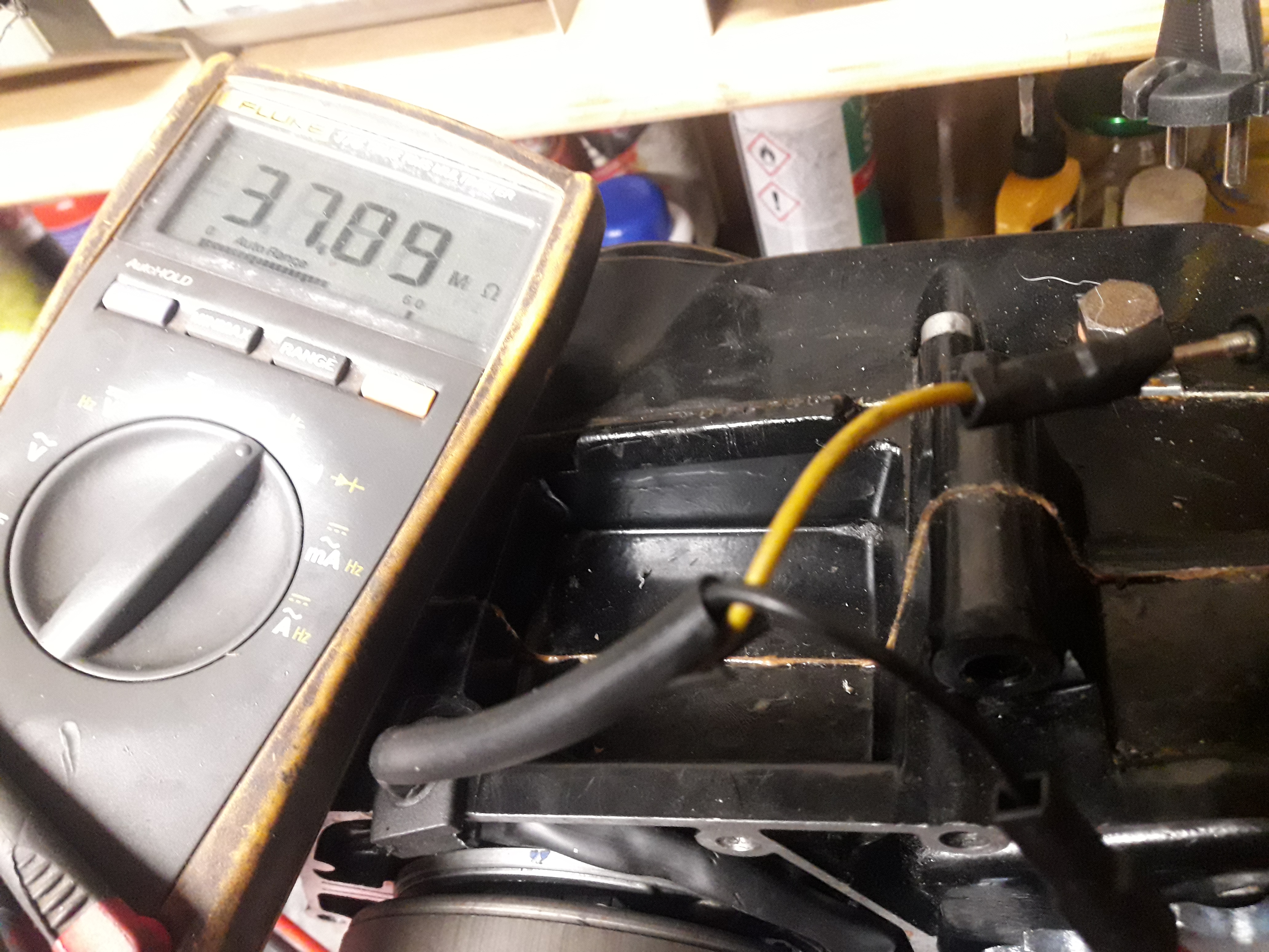 Meet met een multimeter de weerstand van cilinderkop naar carter voor de zekerheid, roestige draadeinde met verroeste moeren geleid slecht.