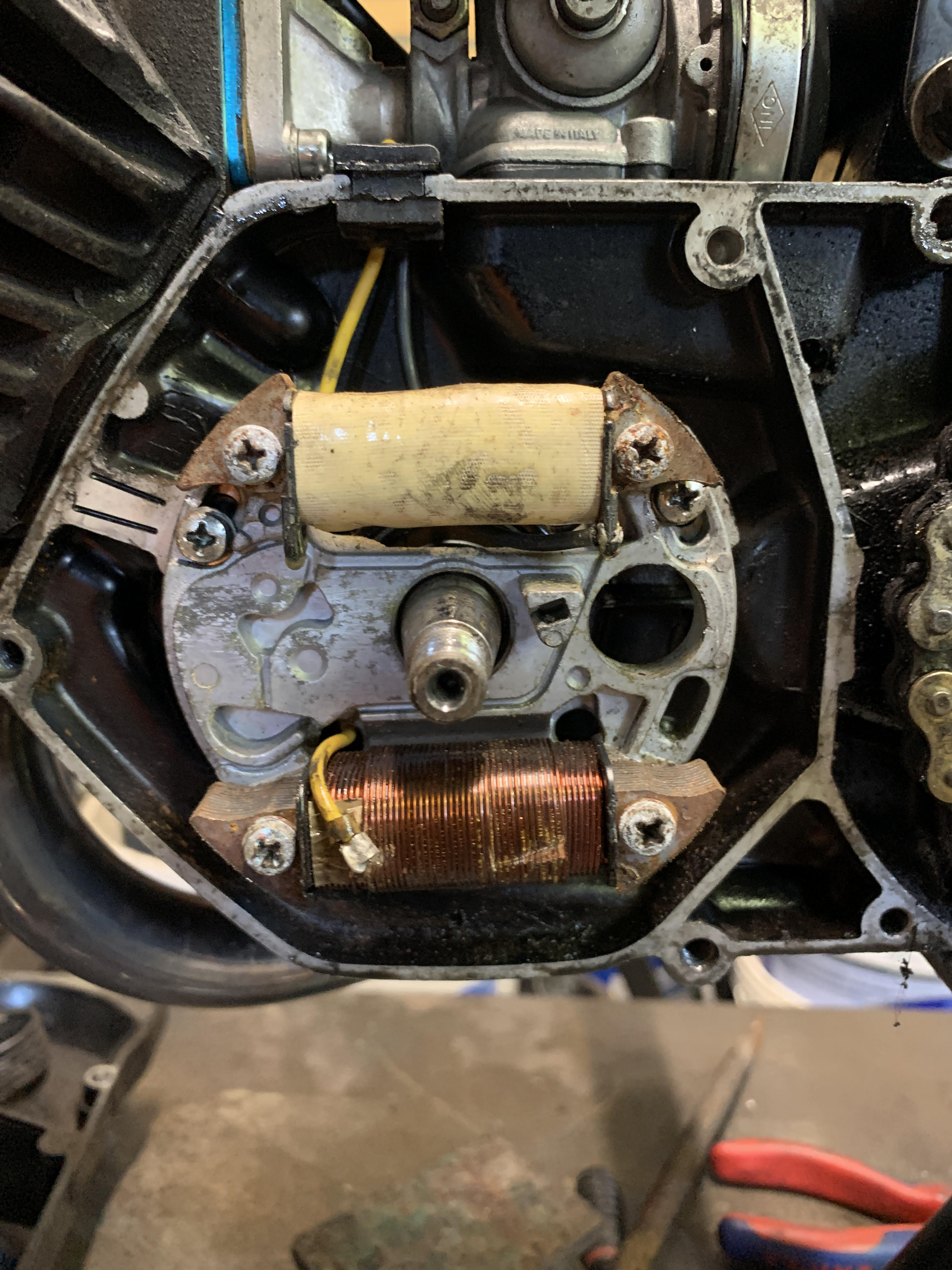 Klopt het verder ook dat er geen condensator en contact puntje op mijn ontsteking zitten? Ik zie deze overal op zitten maar heb er verder niks afgeschroefd dit was gewoon toen ik het vliegwiel eraf trok.