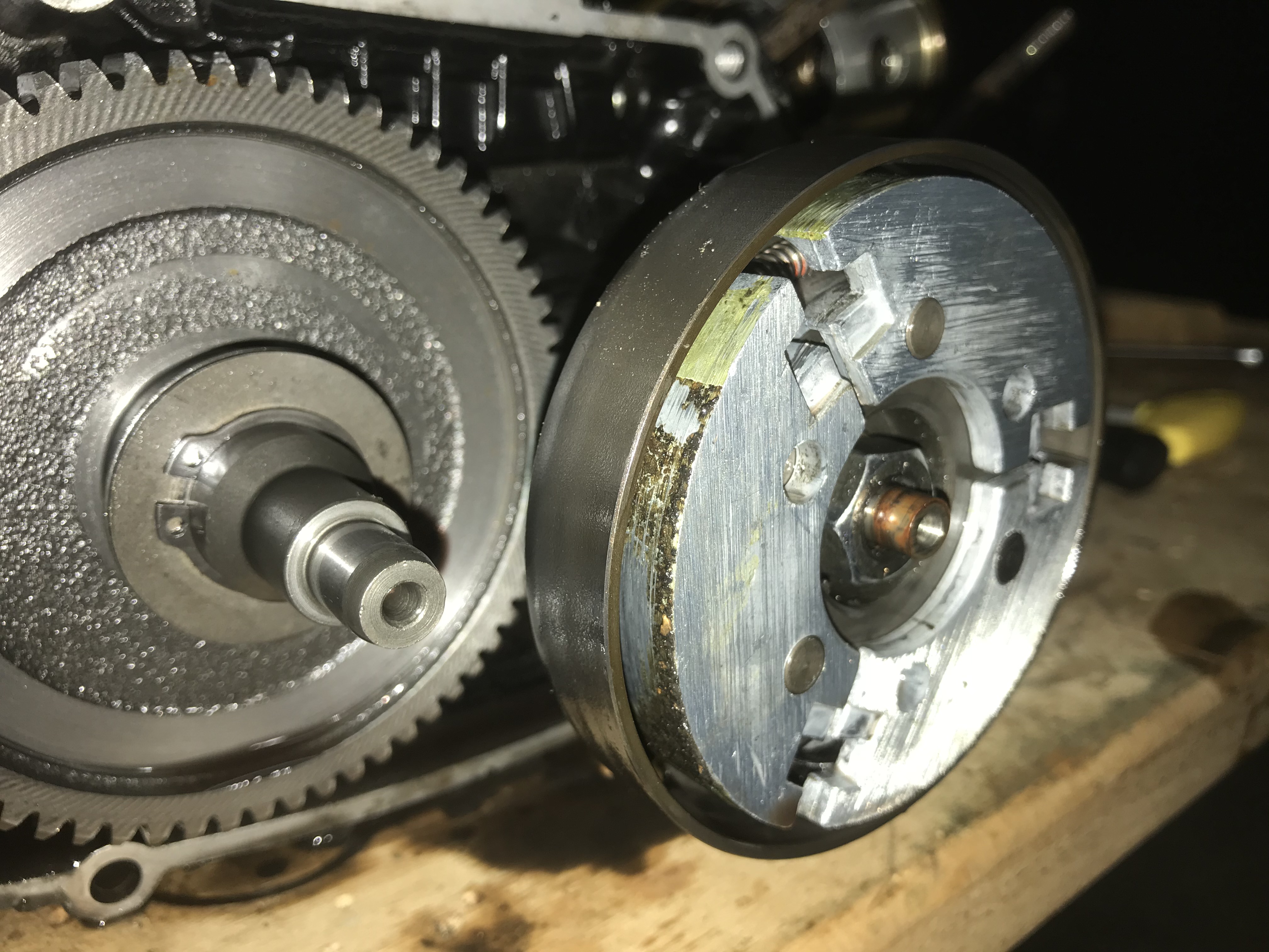 Koppeling hart van dit 1-speed blok heeft een andere aansluiting op de kruktap (plat ovaal, zie foto hieronder) dan de huidige blokken (vertanding). Daardoor zit deze er strakker op dan met inwendige vertanding. Met een uitwendige poelitrekker krijg je hem er wel af als je de moer hebt losgedraaid.