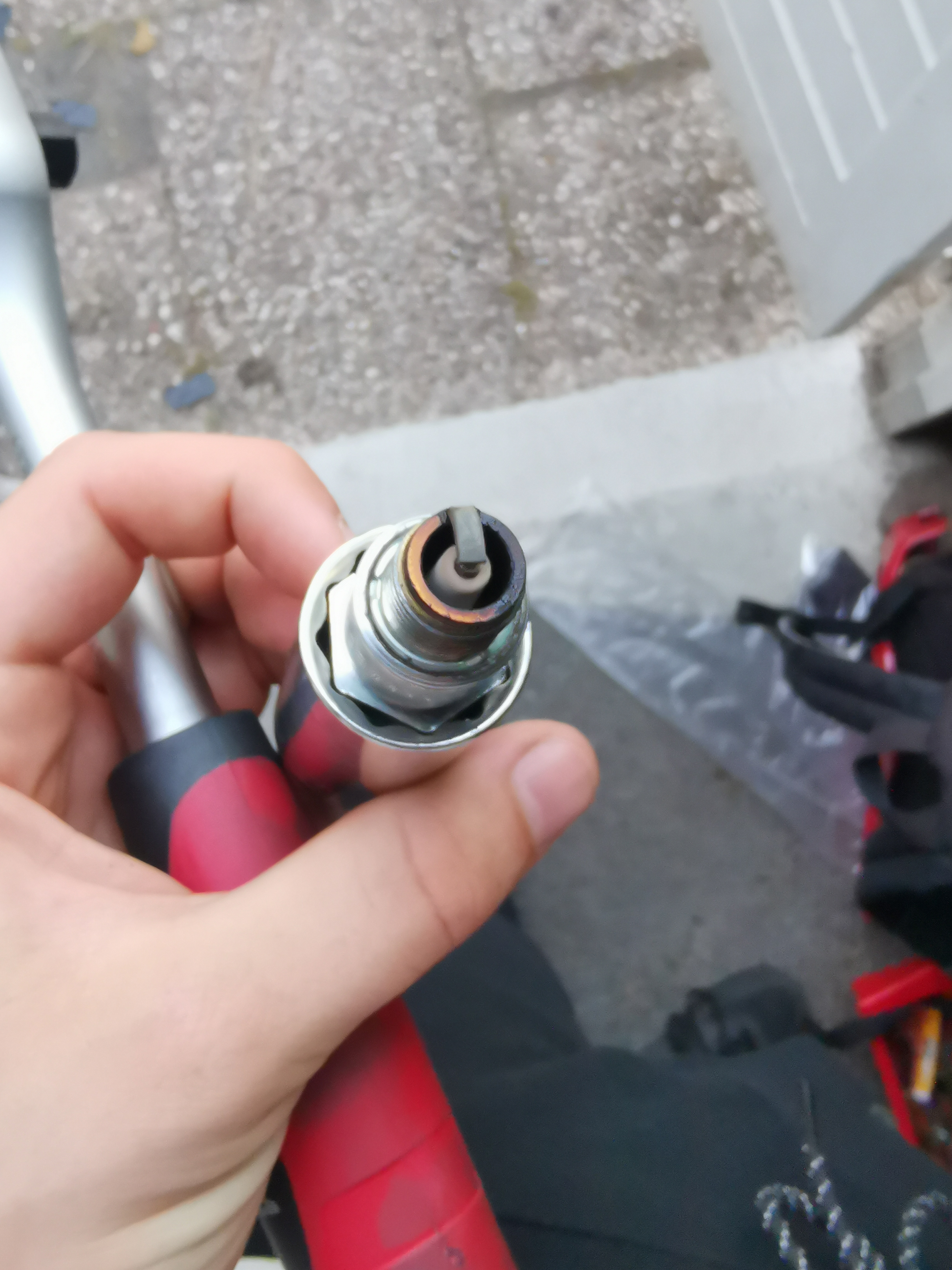 Ik zie aan de rand van je bougie een zwarte/ natte laag, wat duidt op een onvolledige verbranding en dus te rijke afstelling. Wat fons716 al aageeft, warme lucht kan minder brandstof bevatten dan koude lucht, dus in de zomerdagen kan het zijn (zeker nu de temperaturen richting de 30 graden gaan) kan dan juist een grotere sproeier problemen geven. Vaak is de af-fabriek gemonteerde sproeier een compromis tussen de twee uitersten om niet continue de sproeier te hoeven wisselen.