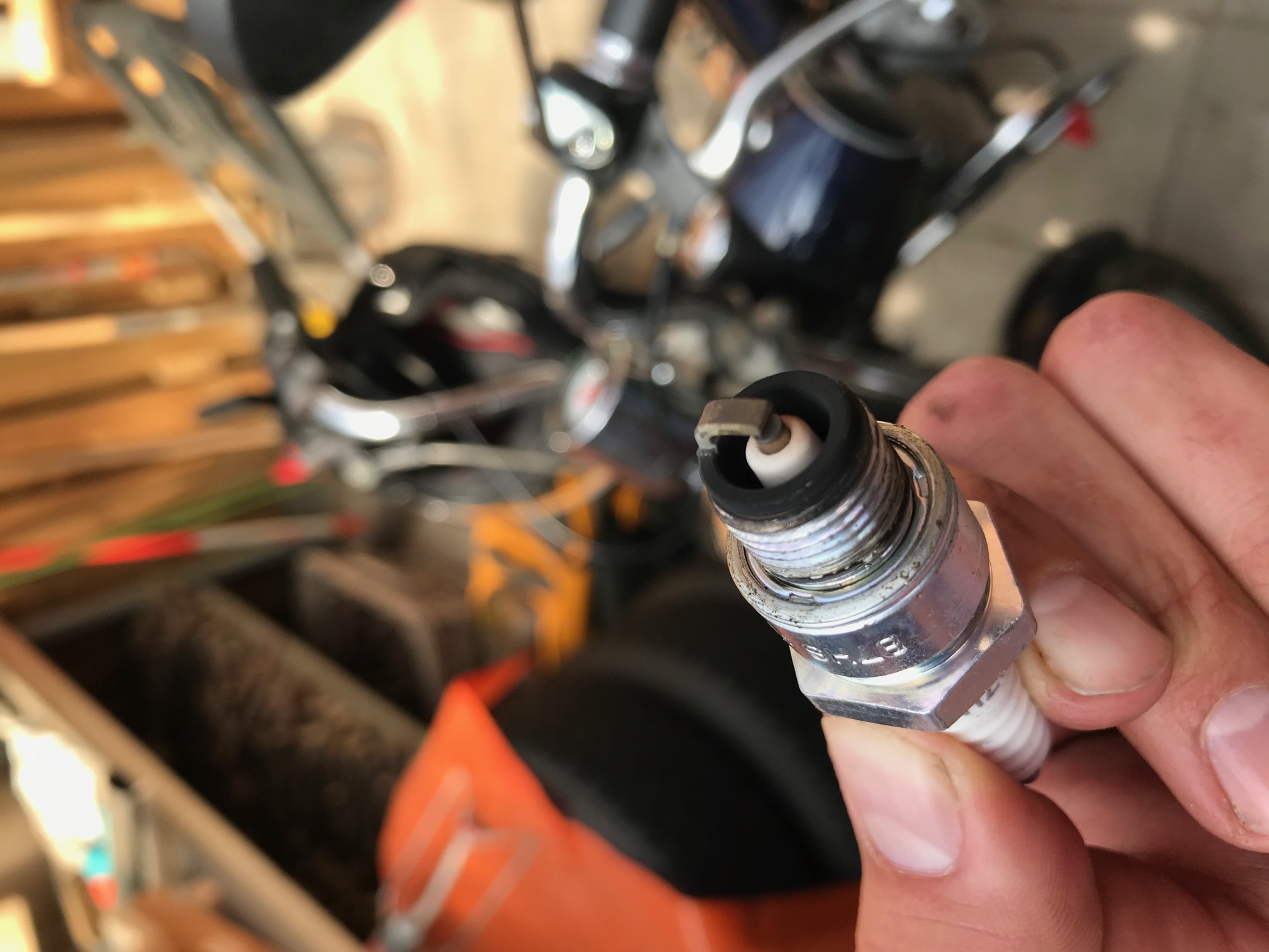 De Tomos liep na deze aanpassingen een stuk beter, merkbaar meer trekkracht. Ongeduldig dat ik was, ik wilde met vrienden een stuk gaan rijden, heb ik niet eerst een stuk gereden en daarna de bougie bekeken om te beoordelen of de sproeiermaat goed is. Erg dom, ik weet het. Tijdens deze lange rit begon de Tomos steeds moeizamer te lopen en sloeg een paar keer af bij het stoplicht. Het vermogen leek steeds verder weg te vallen. Op een gegeven moment hield de Tomos er helemaal mee op en er zit sindsdien geen beweging meer in de kickstart. Bij thuiskomst heb ik de bougie bekeken, zie afbeelding.