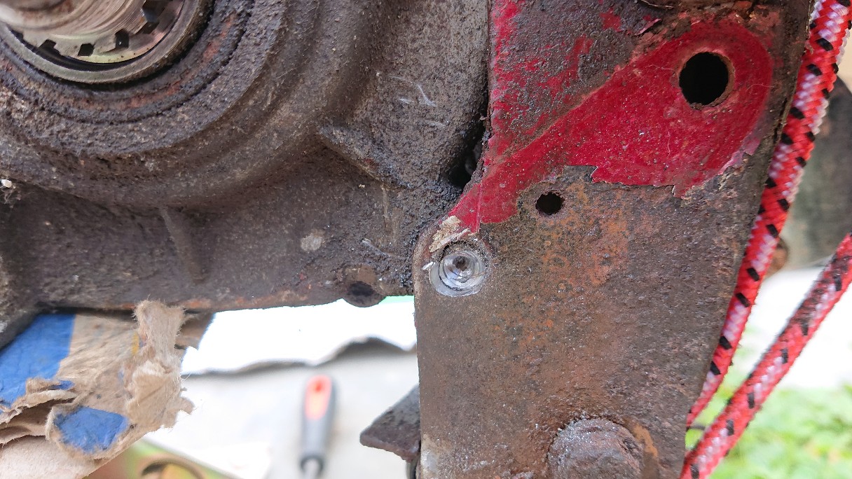 Het motorblok zit met twee bouten boven vast en een bout onder. Deze onderste bout gaat 't om en zit dus helemaal vastgeroest.