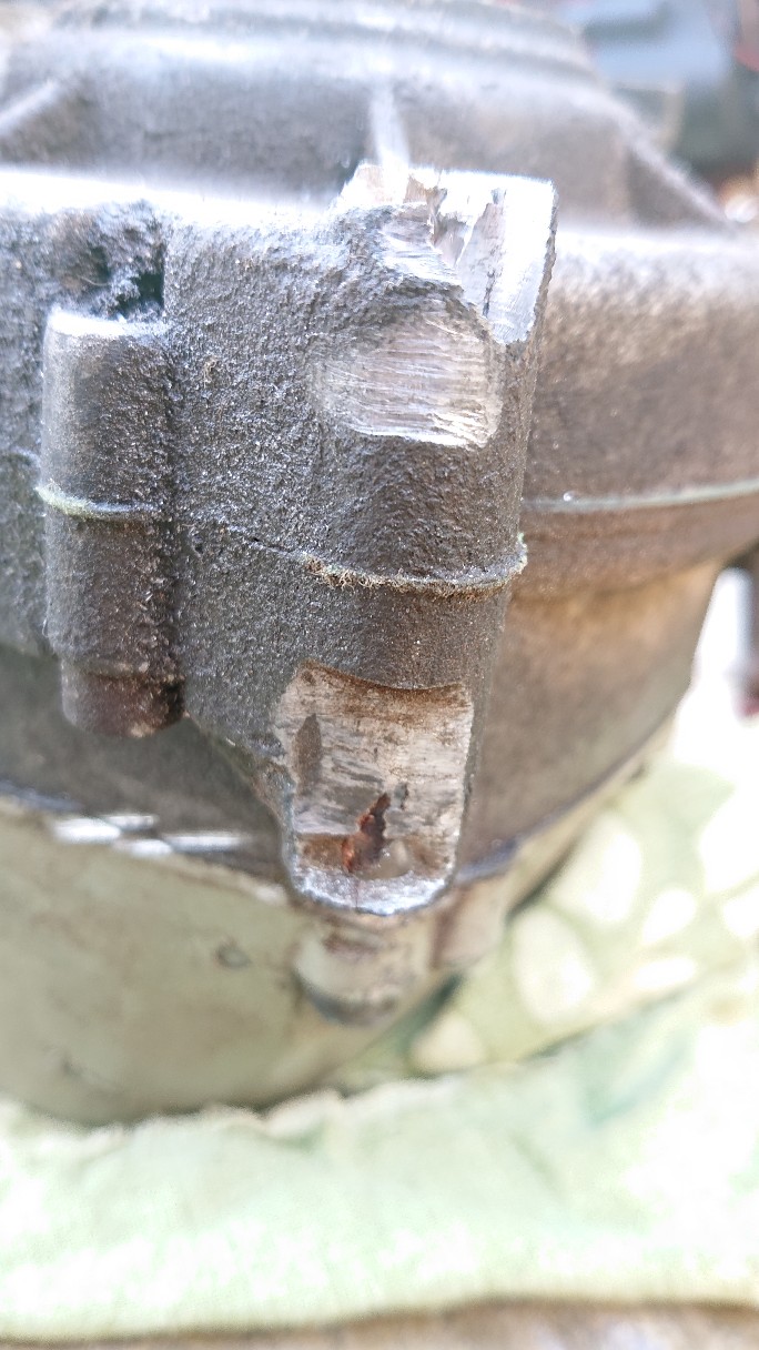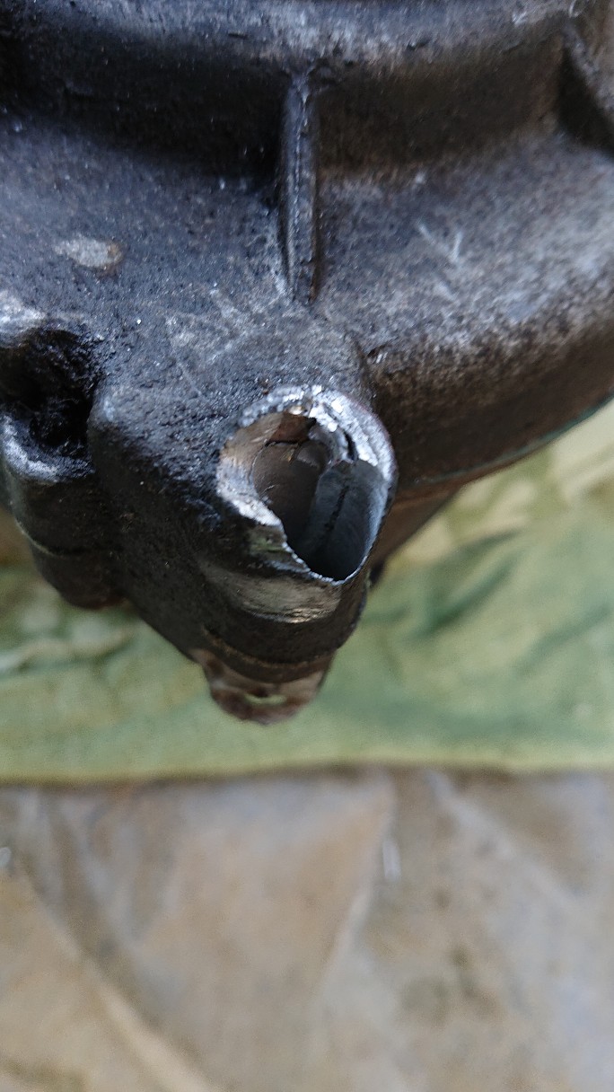 Het is de bout die door het motorblok moet worden gestoken. Inmiddels is de kop van de bout afgebroken. De schroef aan de andere kant heb ik met een slijptol eraf gekregen. Heb alles geprobeerd: