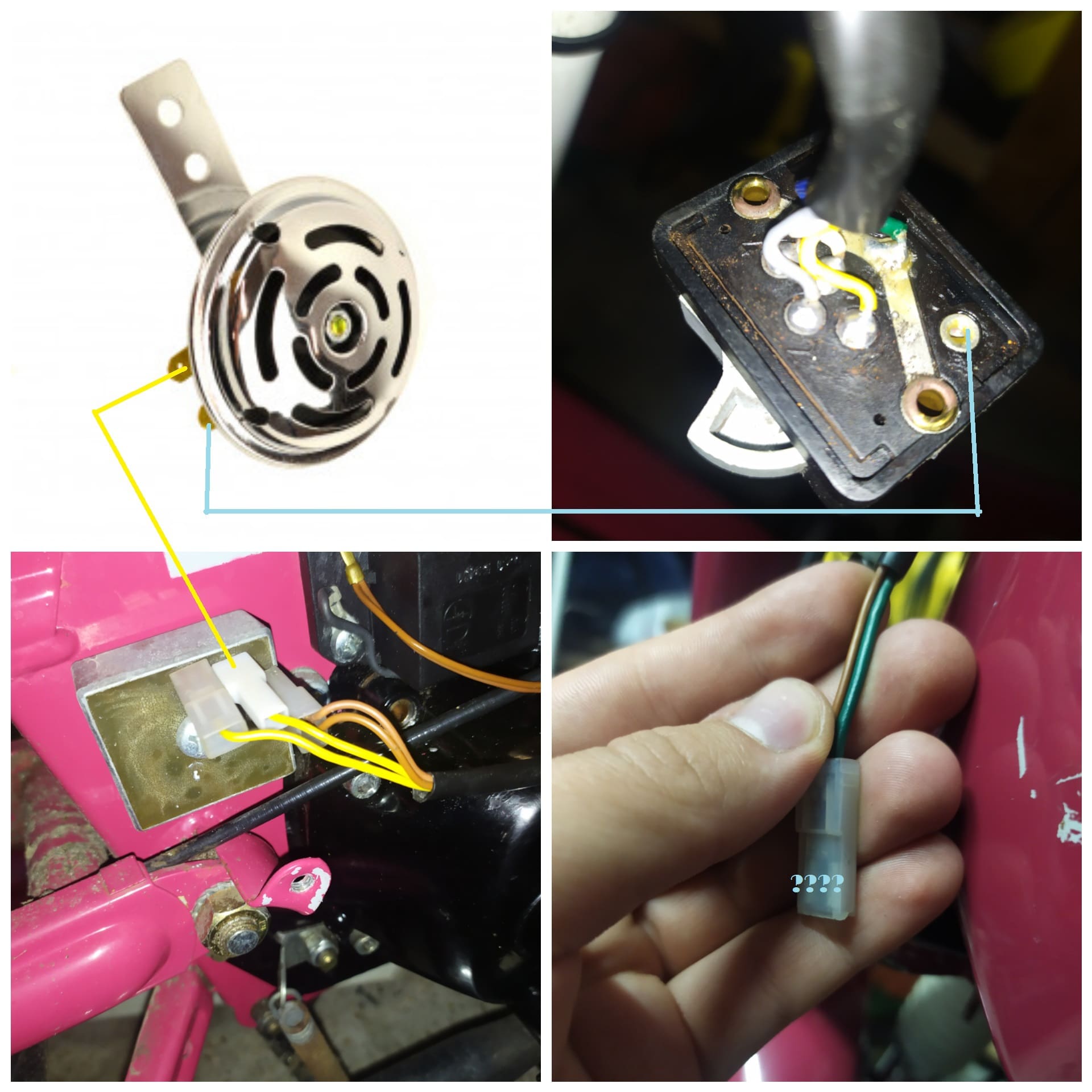 Ik wil een Claxon erop installeren maar ik weet niet hoe ik het moet aansluiten. Ik weet dat ik nog een kabel moet solderen op de knop aangezien die mist.