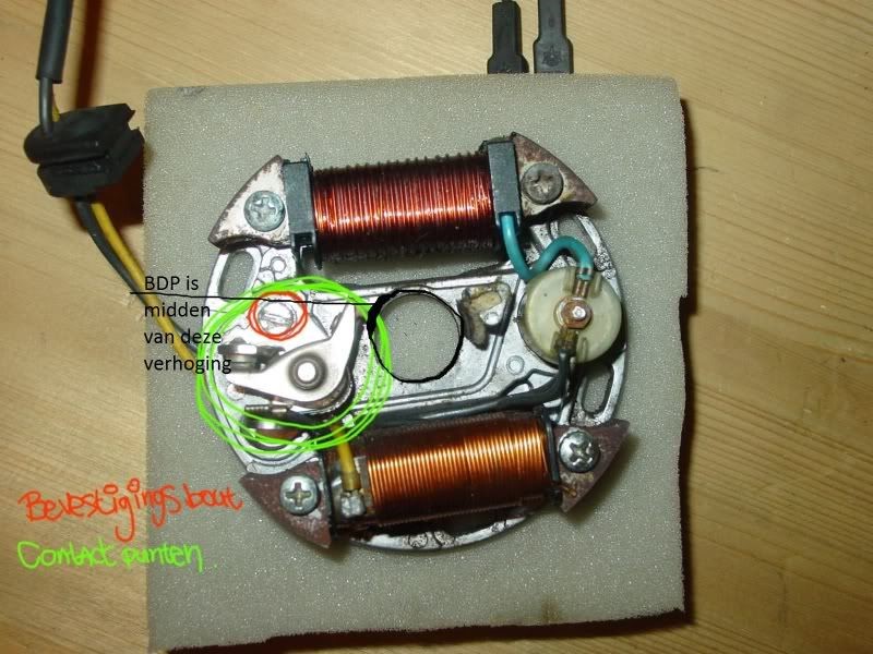 Een punten ontsteking past gewoon op het nieuwe type carter, viltje op de grondplaat smeert de nok van het vliegwiel die de puntjes open drukt dus viltje moet je nat maken met een paar druppels olie anders slijt het nokje van de punten nog sneller.