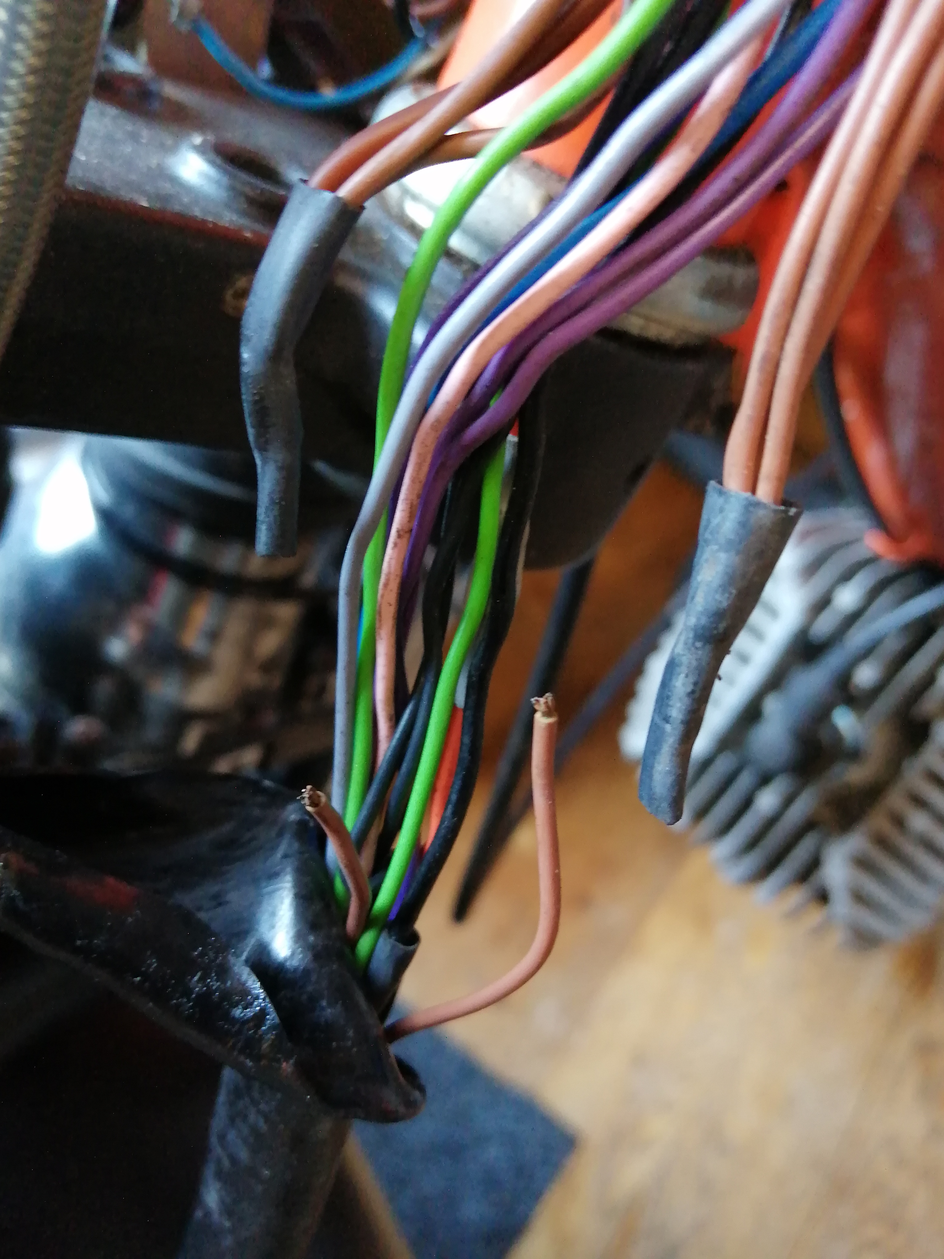 Alles nagezien en omhulsel van de hoofdkabel losgeknipt. Waar de bruine massadraden overgaan van 4 in 1 en 3 in 1 was door het draaien van het stuur de verbinding losgeraakt. Opnieuw gesoldeerd en alles ok.
