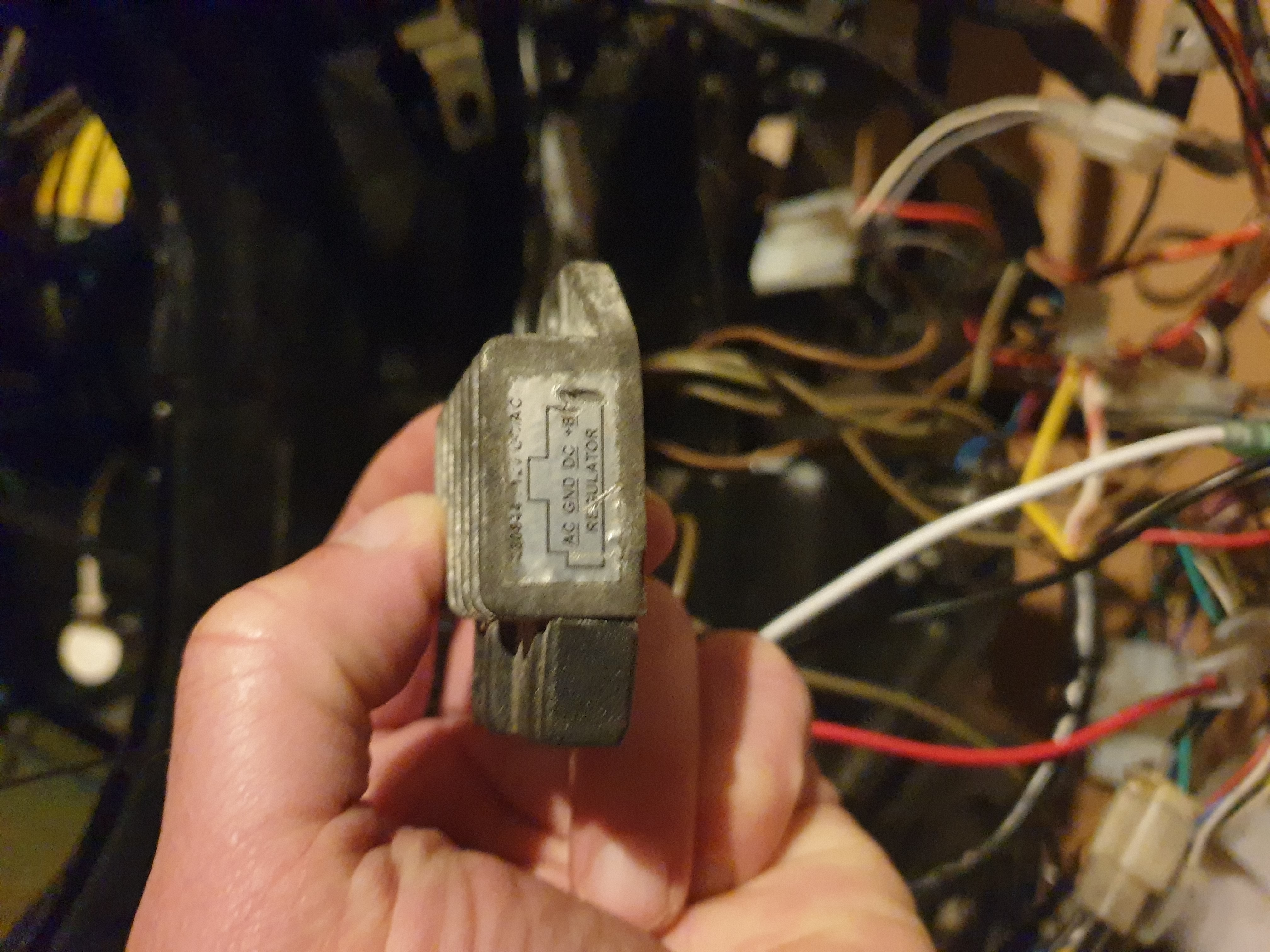 Als ik je verhaal zo lees lijkt t wel of je van de e-start kabelboom/ blok het geheel aansluit op een AC spanningsregelaar ipv een DC regelaar. Kun je eens een foto maken van je spanningsregelaar?
