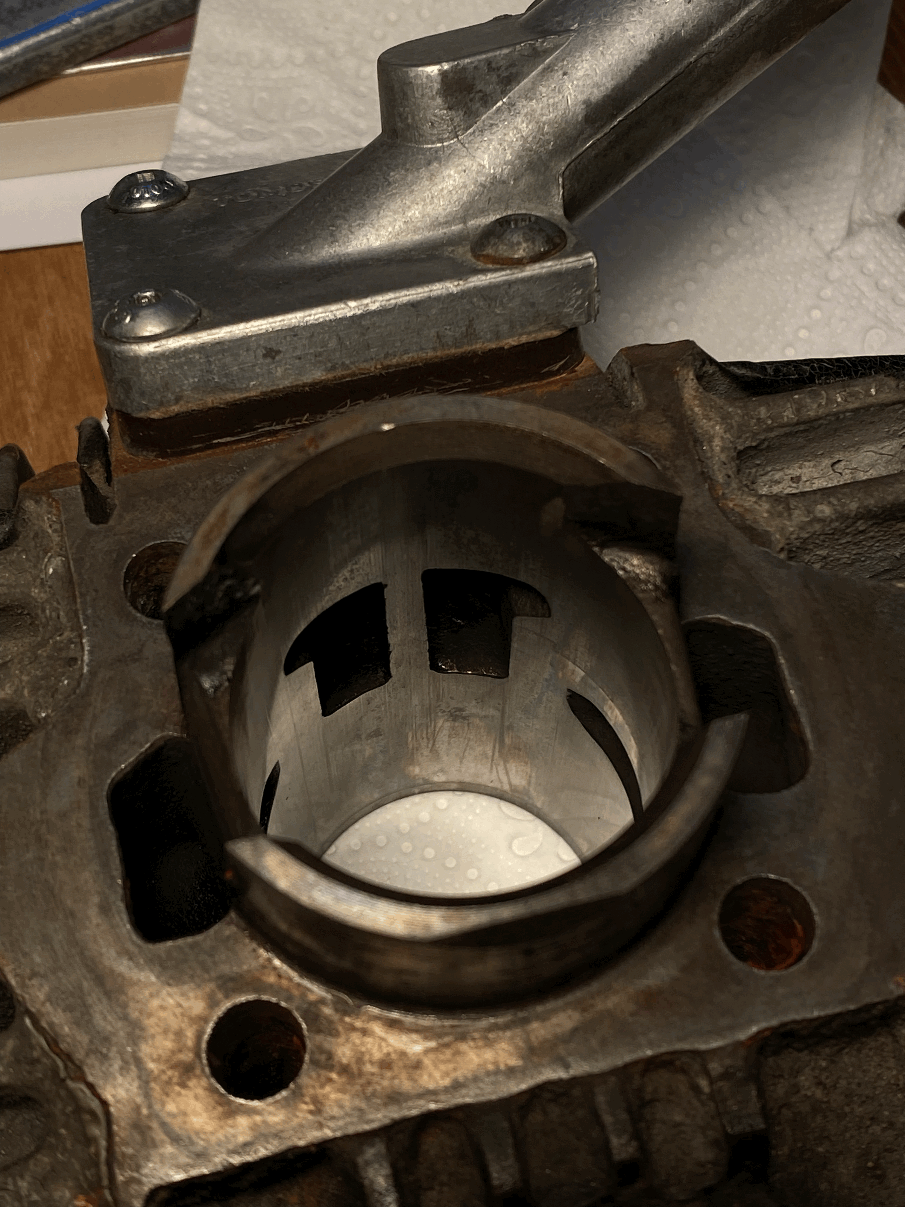 Toen las ik dat het ook de naaldlager in de zuiger kon zijn. Cilinder eraf gehaald. Gelijk de nieuwe zuiger geïnspecteerd. Hier zag ik dat er boven en onder krassen waren ontstaan (zie fotos). Nu is mijn vraag is dit normaal? Ook in mijn cilinder zie ik wel sporen van beweging maar. De krassen in zijn overigens niet voelbaar. En heeft dit misschien te maken met het nieuwe geluid ook?
