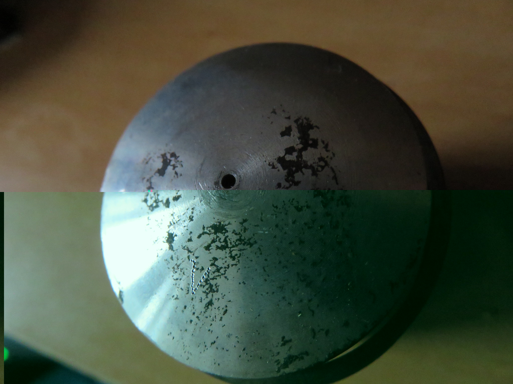 een diep gaatje zover ik kan zien en rondom is hij weggeslagen. dat zie je als je hem uitvergroot.