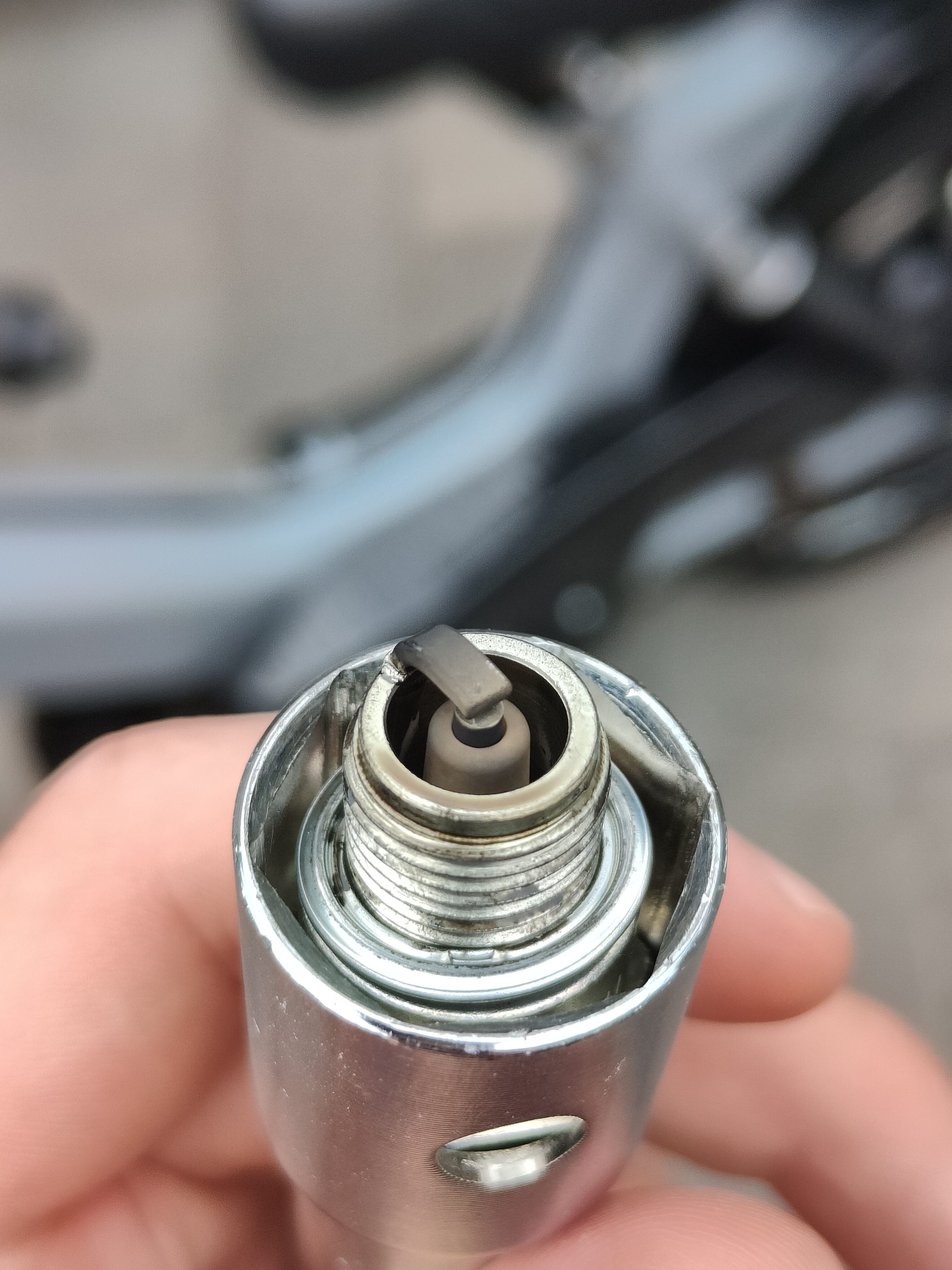 Rijd goed en trekt verder redelijk goed op en blijft stationair ook goed lopen. Ik rijd nu 44 km/h op GPS en na een klein testritje heeft m'n bougie deze kleur. Nog iets aanpassen aan de sproeier?