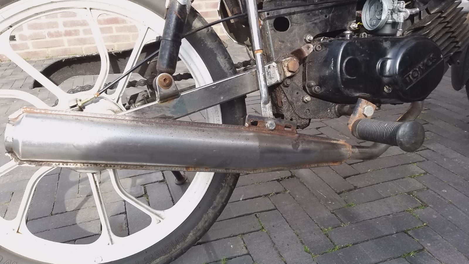 Dat is dus de kickstartremveer of omegaveer. Die is krom, niet gebroken. Daarom draait je kickstart mee omdat deze niet losgekoppeld wordt. Vervangen is het advies.