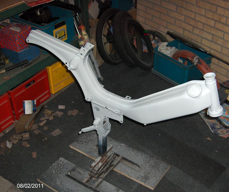 Na lang schuren staat het frame nu in de primer.
