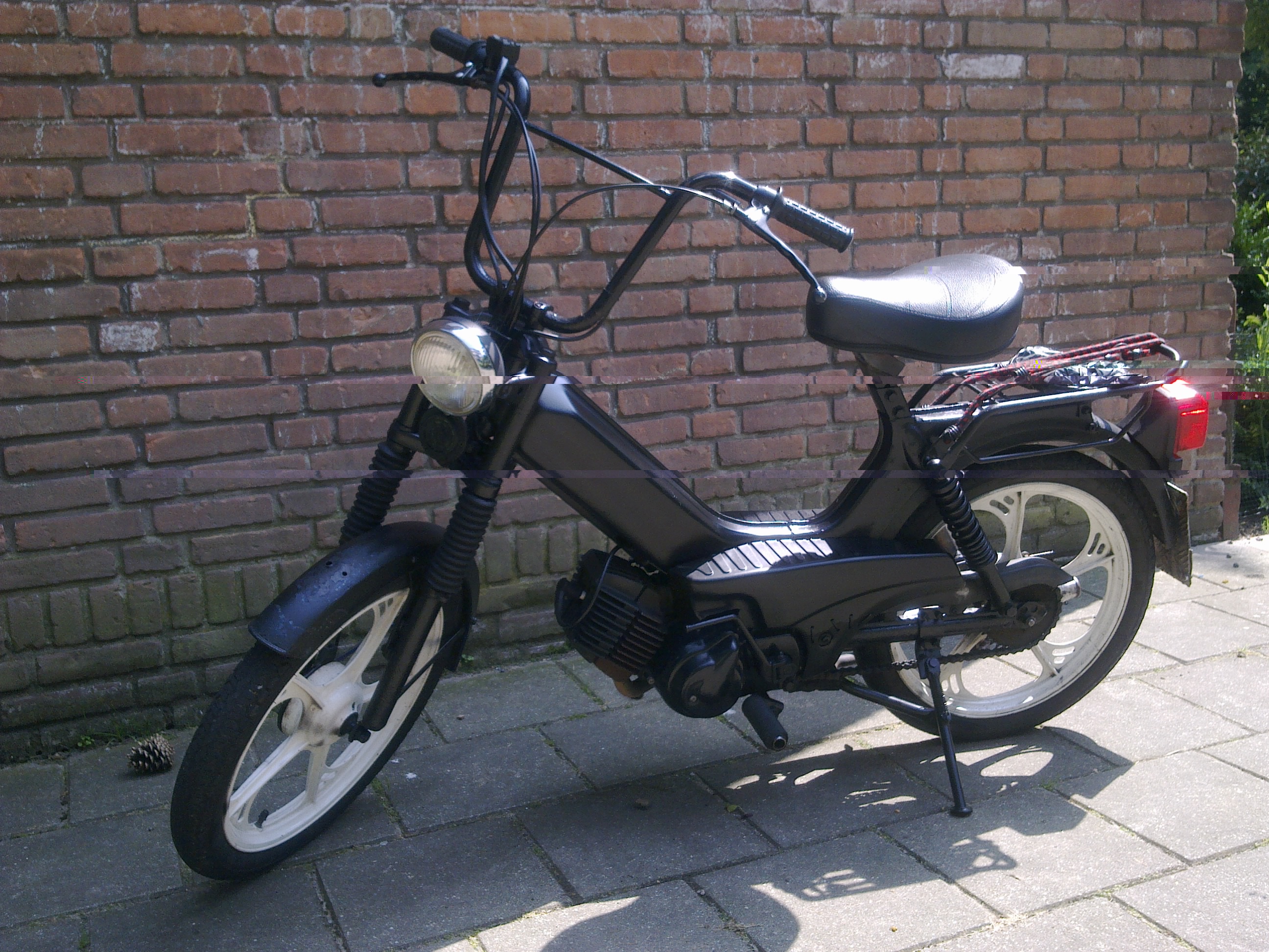 En ik heb m'n tosje echt helemaal mat zwart gespoten (dat is wel mijn kleur, ook mijn auto is die kleur) en de wielen zijn wit