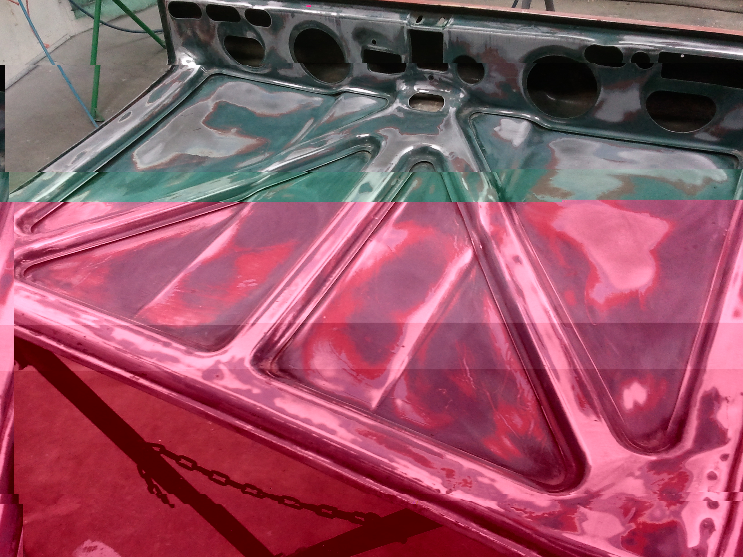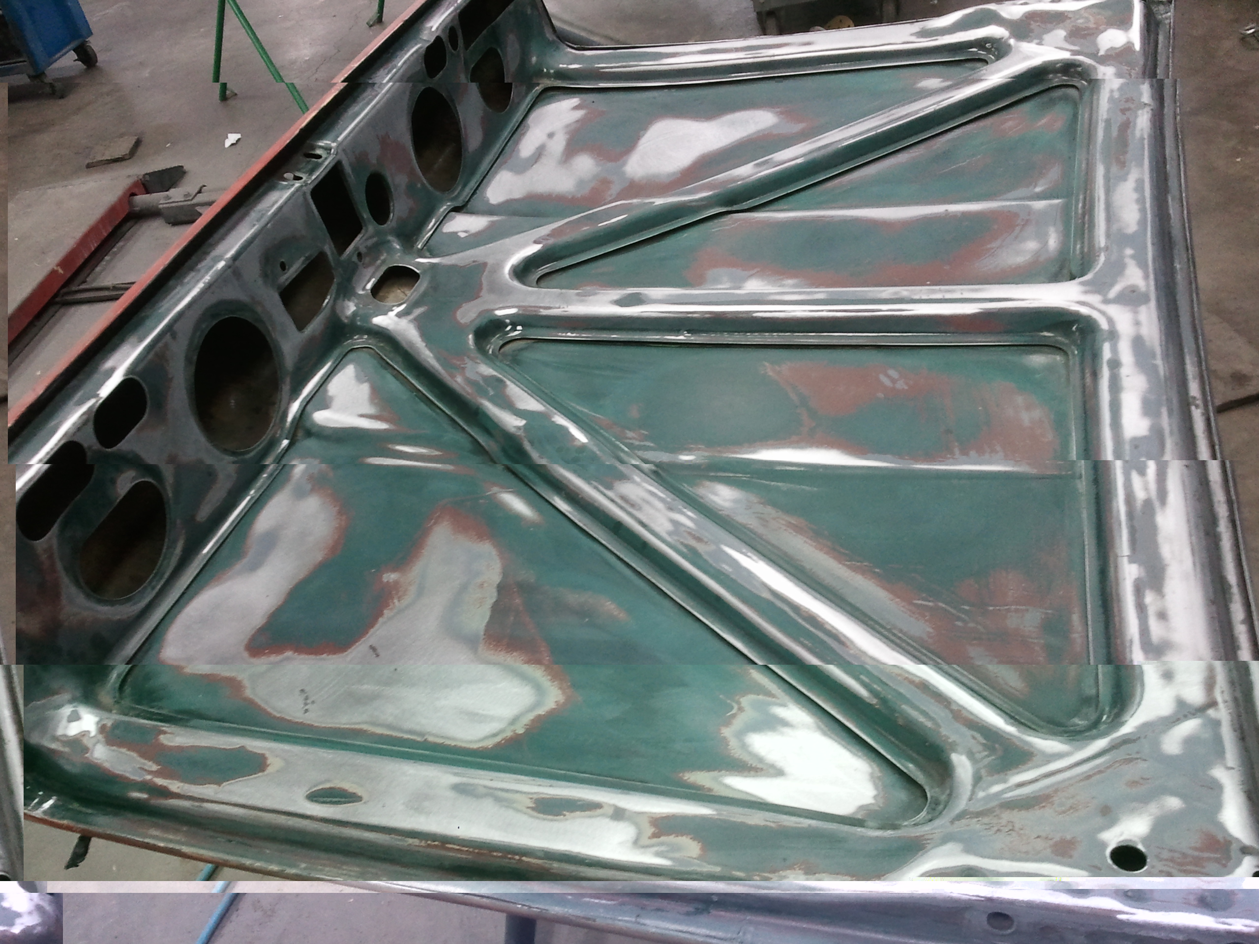 1 deur strak, grondverf klaar en de binnenkant van de kofferklep kaal. Morgen van 10.30 tot 15.45 schuren.