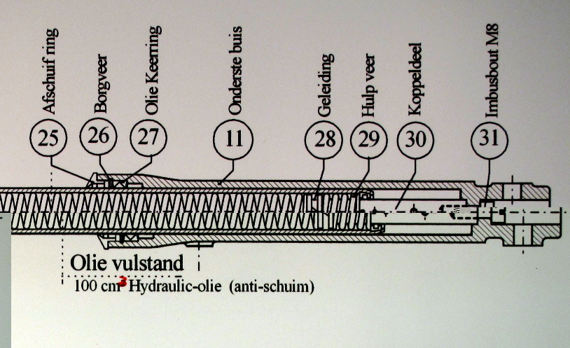 Ik ben in het bezit van enige detail- tekeningen van de moderne voorvork voor b.v.b. Yungster-Funtastic-maar ook een aantal andere tomosjes. Op een van deze tekeningen staat dat elke voorvorkbuis gevuld wordt met 100 cc SCHUIMVRIJE hydrauklic