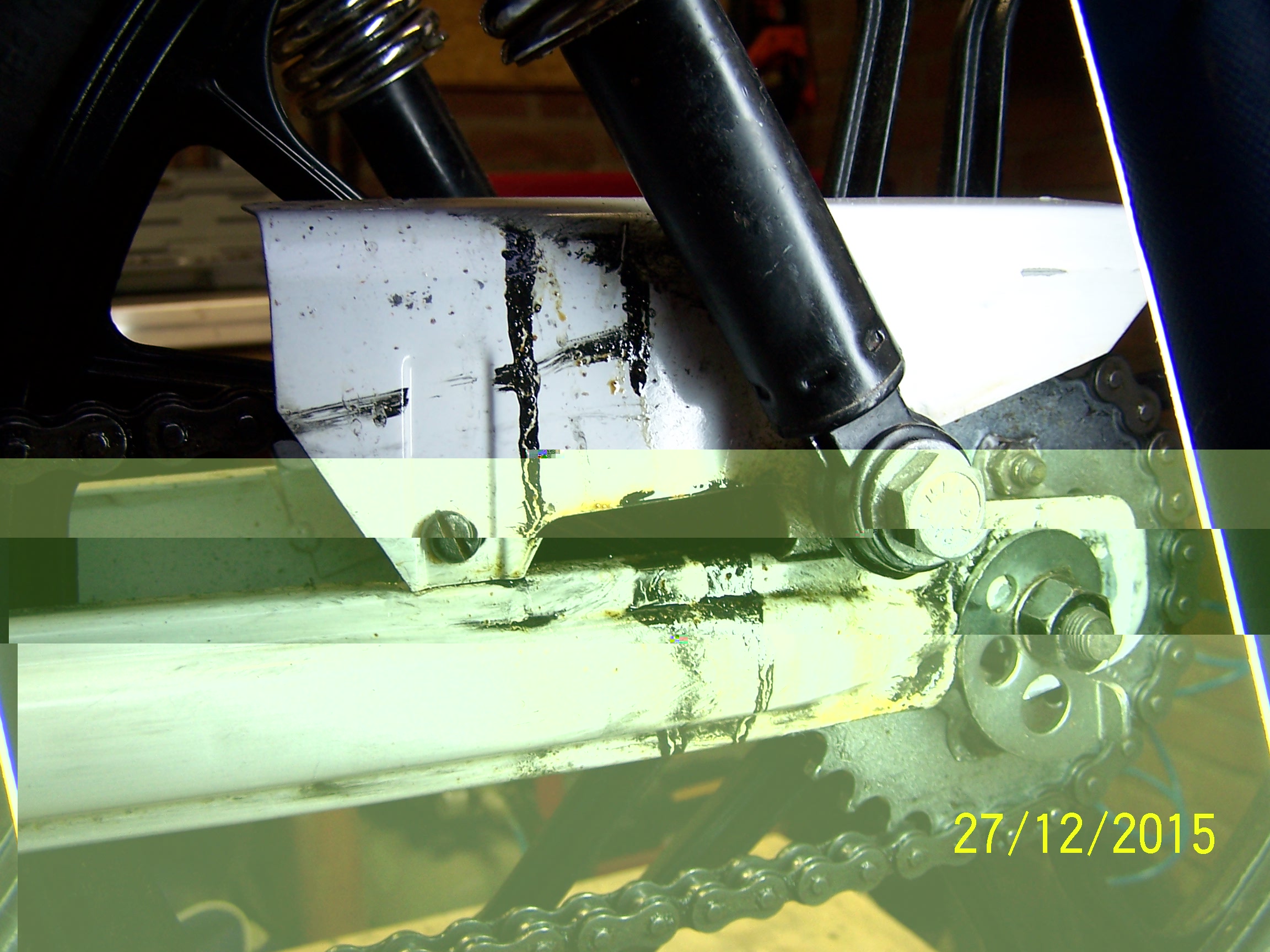 Ook al gevraagd aan een fietsenmaker die roept standaard voortandwiel keerring of kickstartkeerring, nu had ik dat zelf ook in eerste instantie gedacht, maar al paar keer gecontroleerd. Ook lijkt mij dan aangezien mijn ATF rood is, dat hij dan ook rood lekt/ spat en ruikt naar ATF, maar het is gelig. zie foto hier is maar een stukje te zien maar je ziet wel gele residu. Wel heb ik de achterbrug al gedeeltelijk schoongemaakt, na elke rit van ongeveer 14 km doe ik dat omdat alles dan zo onder zit. Voor de rest niets schoongemaakt dus foto zijn zoals het was. Als ik de kap aan kickstart zijde eraf haal namelijk, is de voortandwiel keerring kurkdroog, voortandwiel kurkdroog, moer tandwiel kurkdroog, lekt hij daar dan moeten daar ook oliesporen lopen lijkt mij, was namelijk bij de ander tomosjes bij lekke keerring wel steeds.