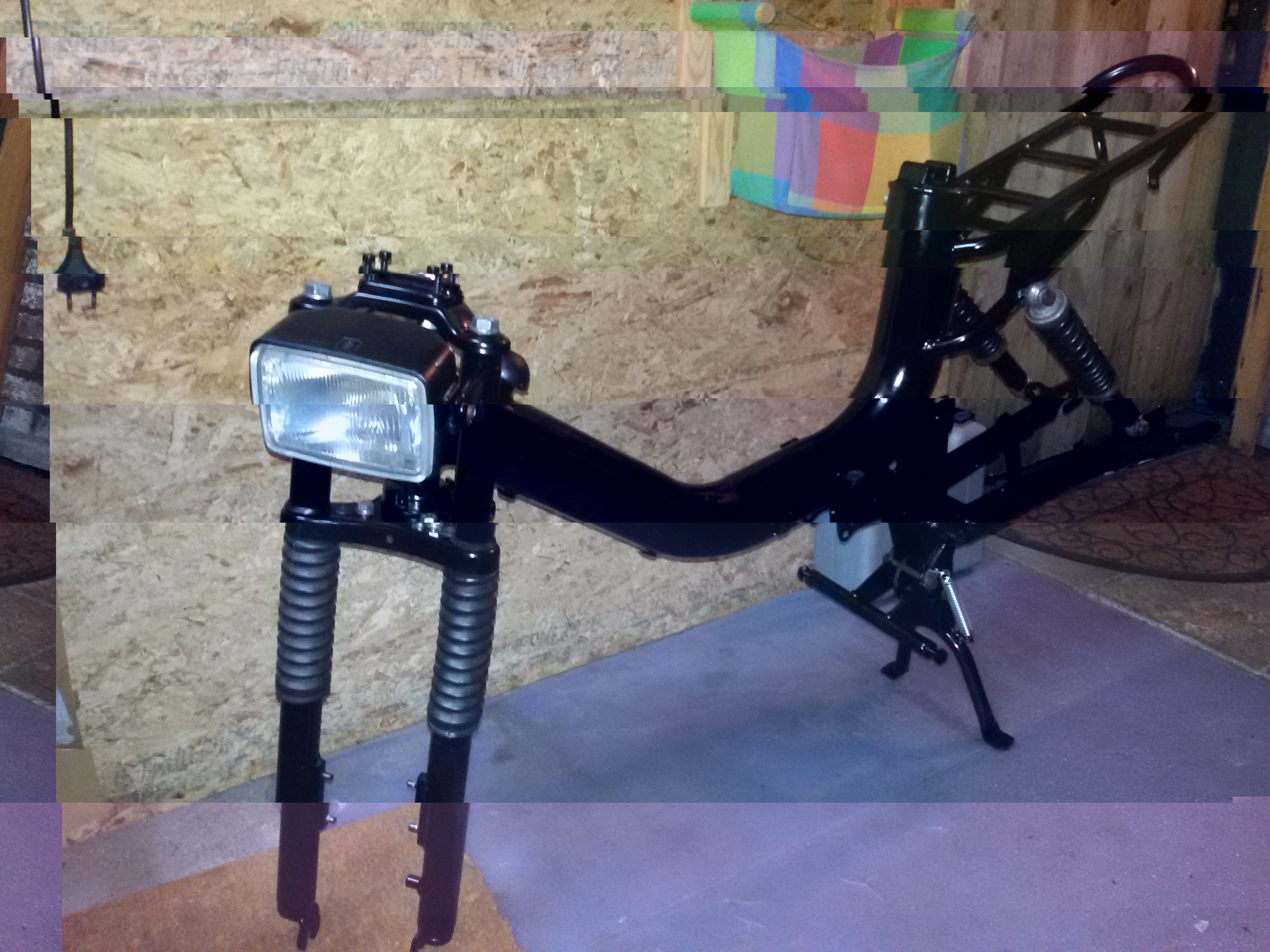 Zoals te zien moeten de kappen nog worden gespoten, dit ga ik doen zodra de temperatuur weet wat hoger is in het voorjaar. Ook moet ik nog iets van zwart rubber vinden voor de bevestiging van het zadel (nu stukjes tuinslang gebruikt) om de poedercoating niet te beschadigen.