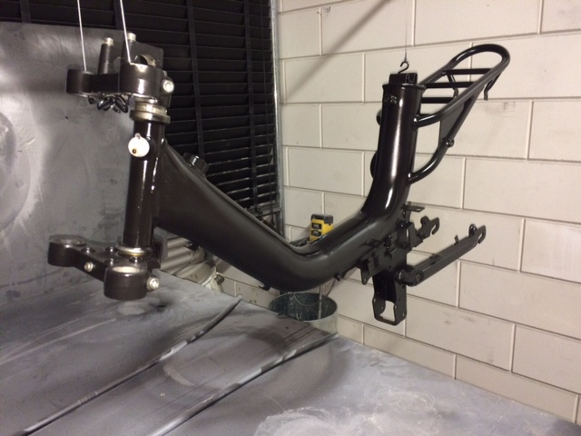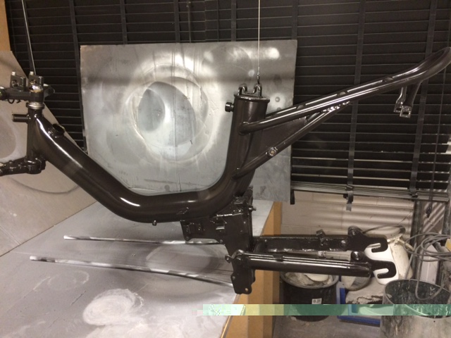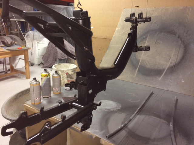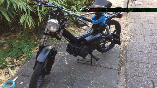 Heb hem na de aankoop helemaal uit elkaar gehaald en goed schoongemaakt. Her en der was er wel wat roest aanwezig dus ik heb alles netjes opgeschuurd. Er zaten hier en daar nog wel wat plekjes roest, maar heb de hele brommer gespoten met Hammerite. Ik heb gekozen voor de combinatie zwart met lichtblauw. Hierbij zwart als basiskleur en maar enkele details met blauw.