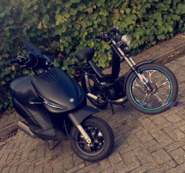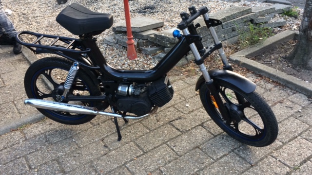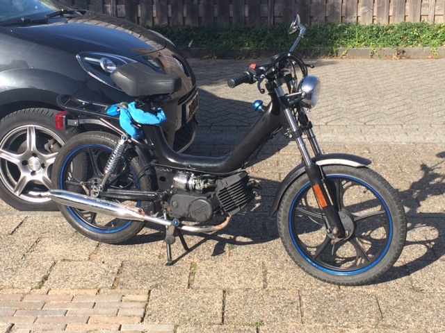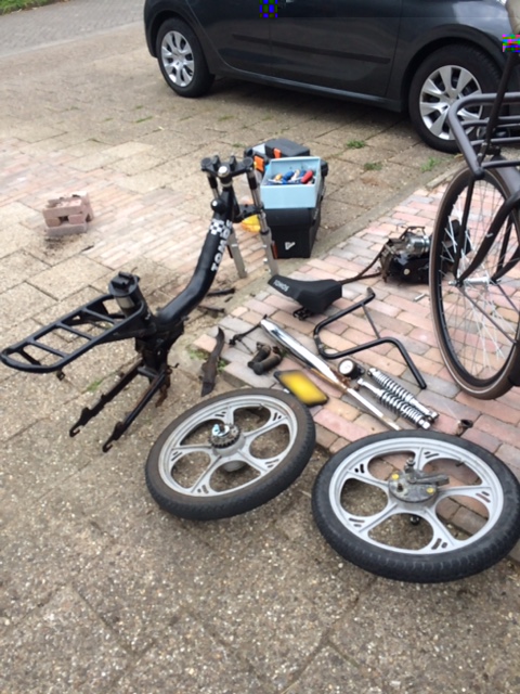 Ik ben Sam uit Houten en ik ben 16 jaar oud. Ben altijd al creatief geweest en nu ik al een tijdje 16 ben, begon het toch te kriebelen om een brommer aan te schaffen. Mijn vrienden hebben allemaal een scooter, ook leuk, maar ik vond dit toch net wat te standaard :roll: . Ook vond ik het wel leuk om iets geks te nemen waar ik ook nog wat te sleutelen aan had.