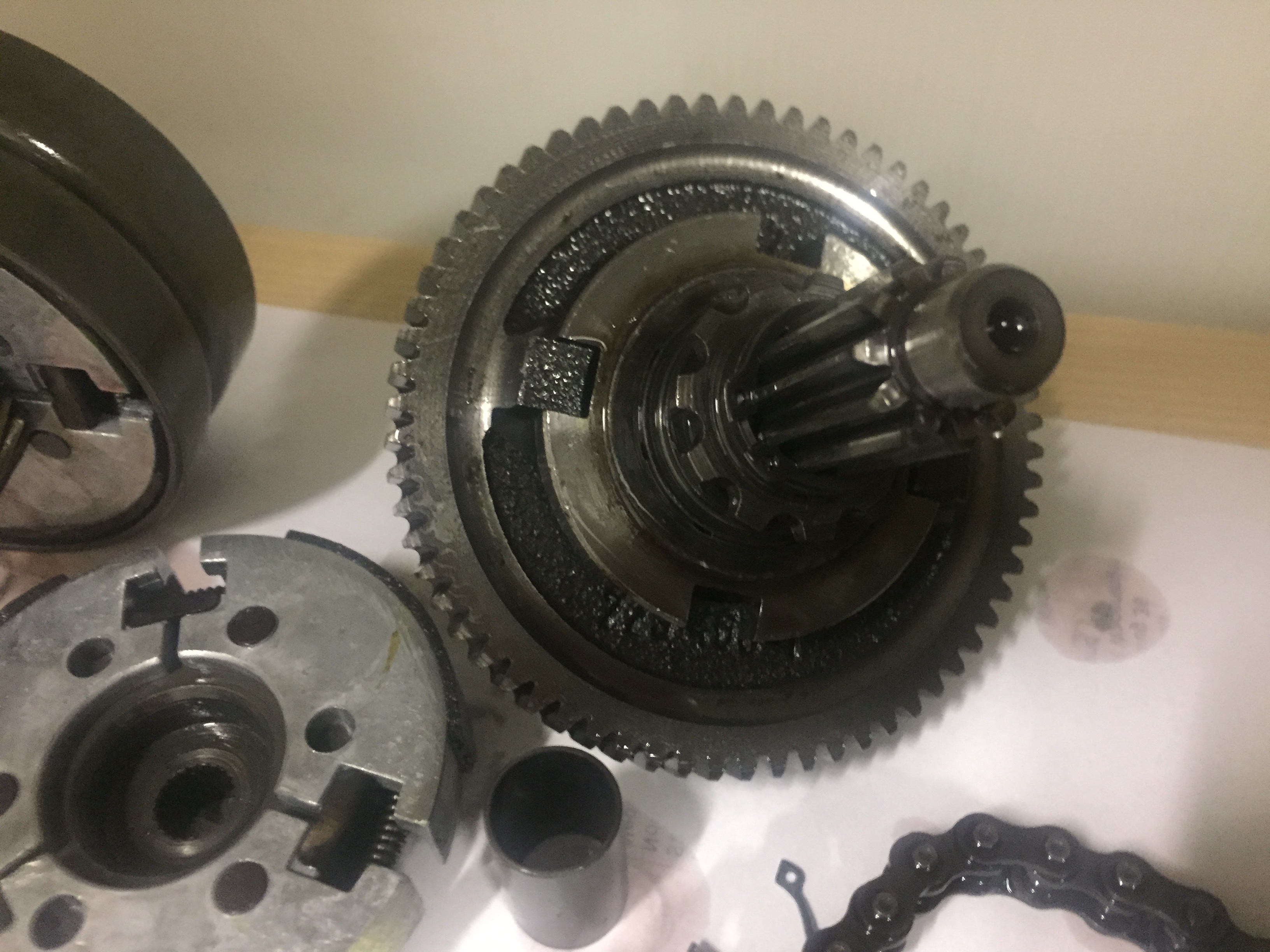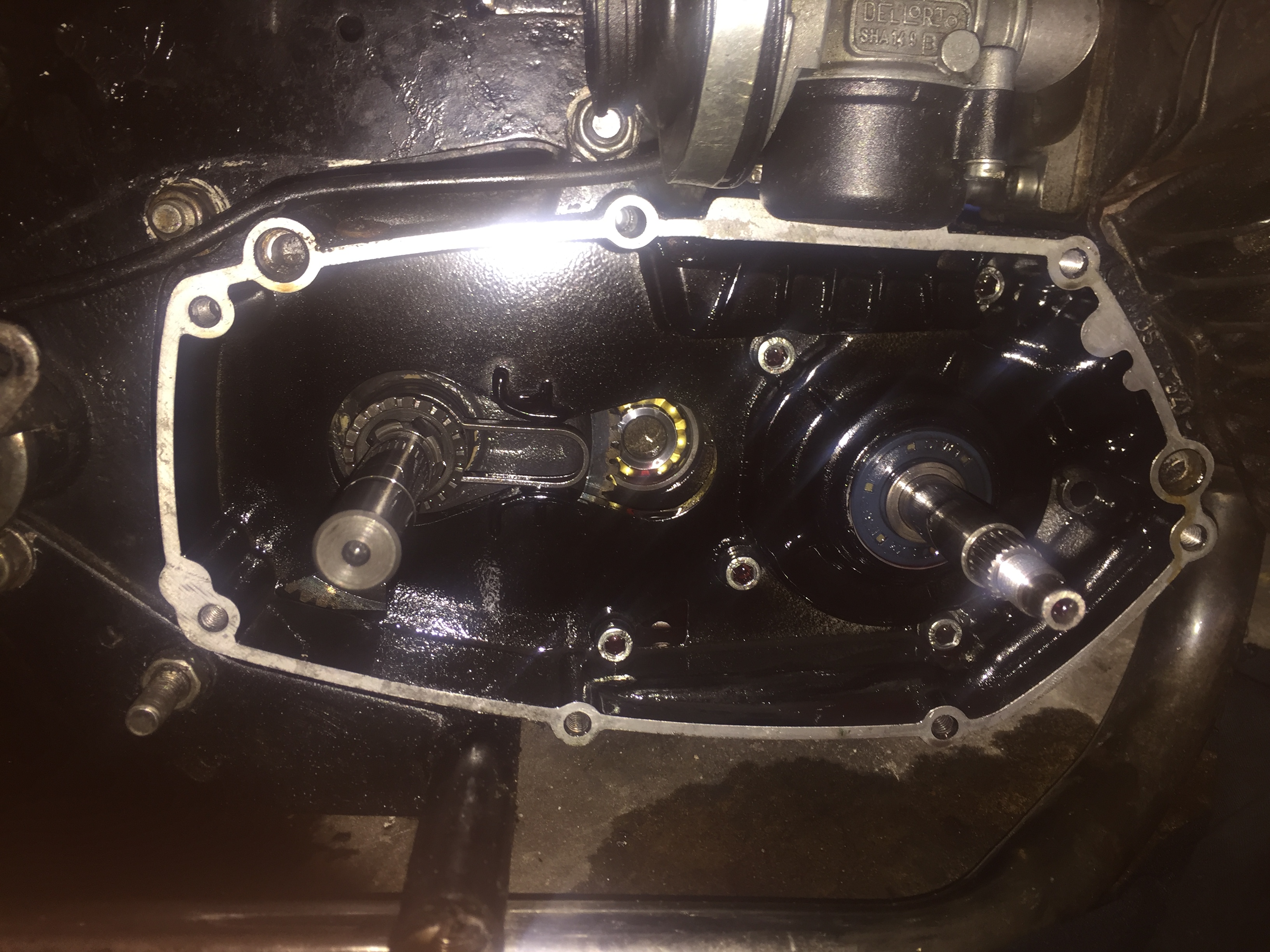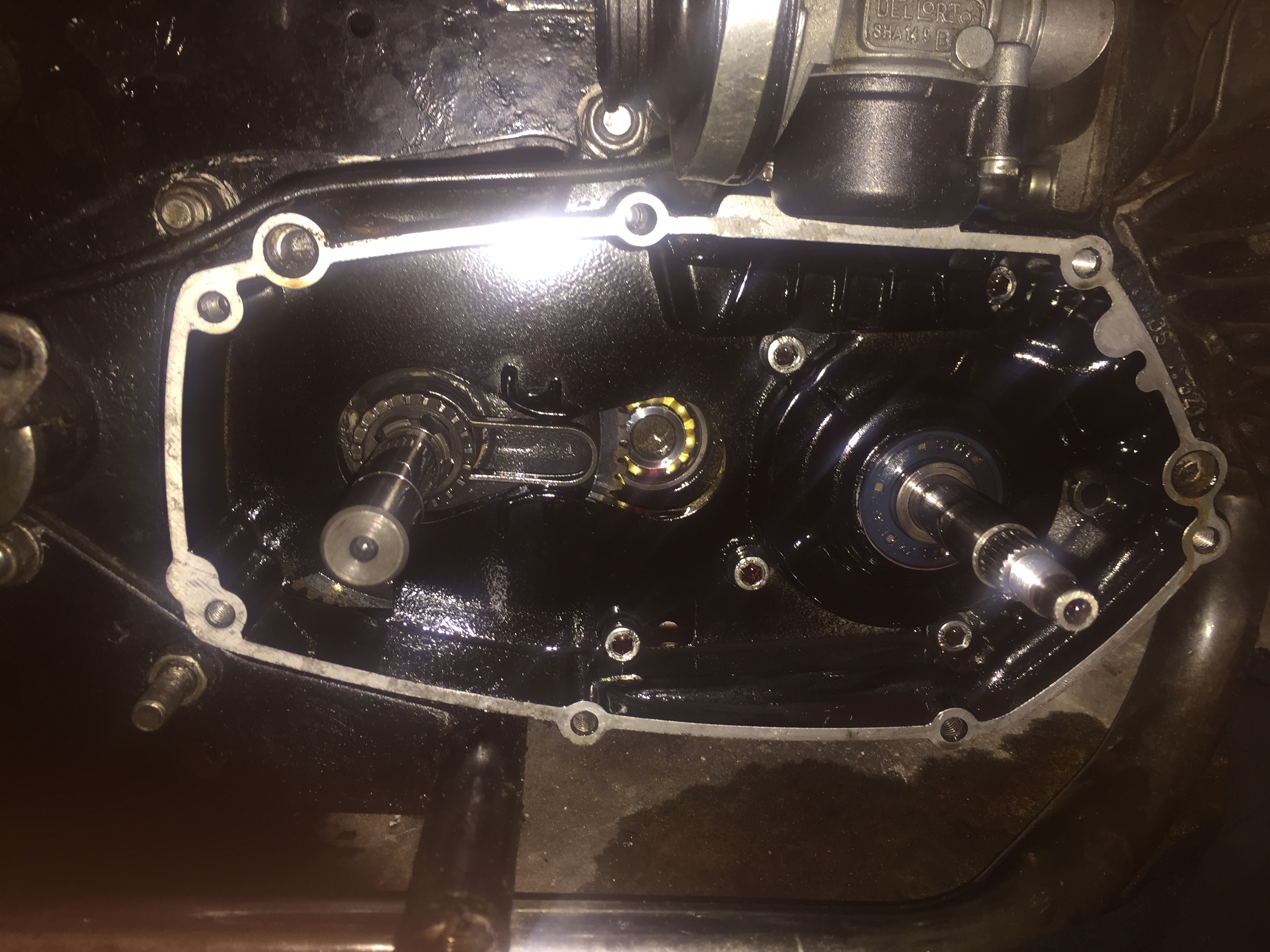 Normaal gesproken lopen alleen het grote tandwiel en de onderrand van het koppelingshuis door de olie. Die spetteren dat overal heen en uiteindelijk krijgt elk onderdeel voldoende smering. Is wat anders dan dat de koppeling door een bak olie moet ploegen. Dat geeft problemen.