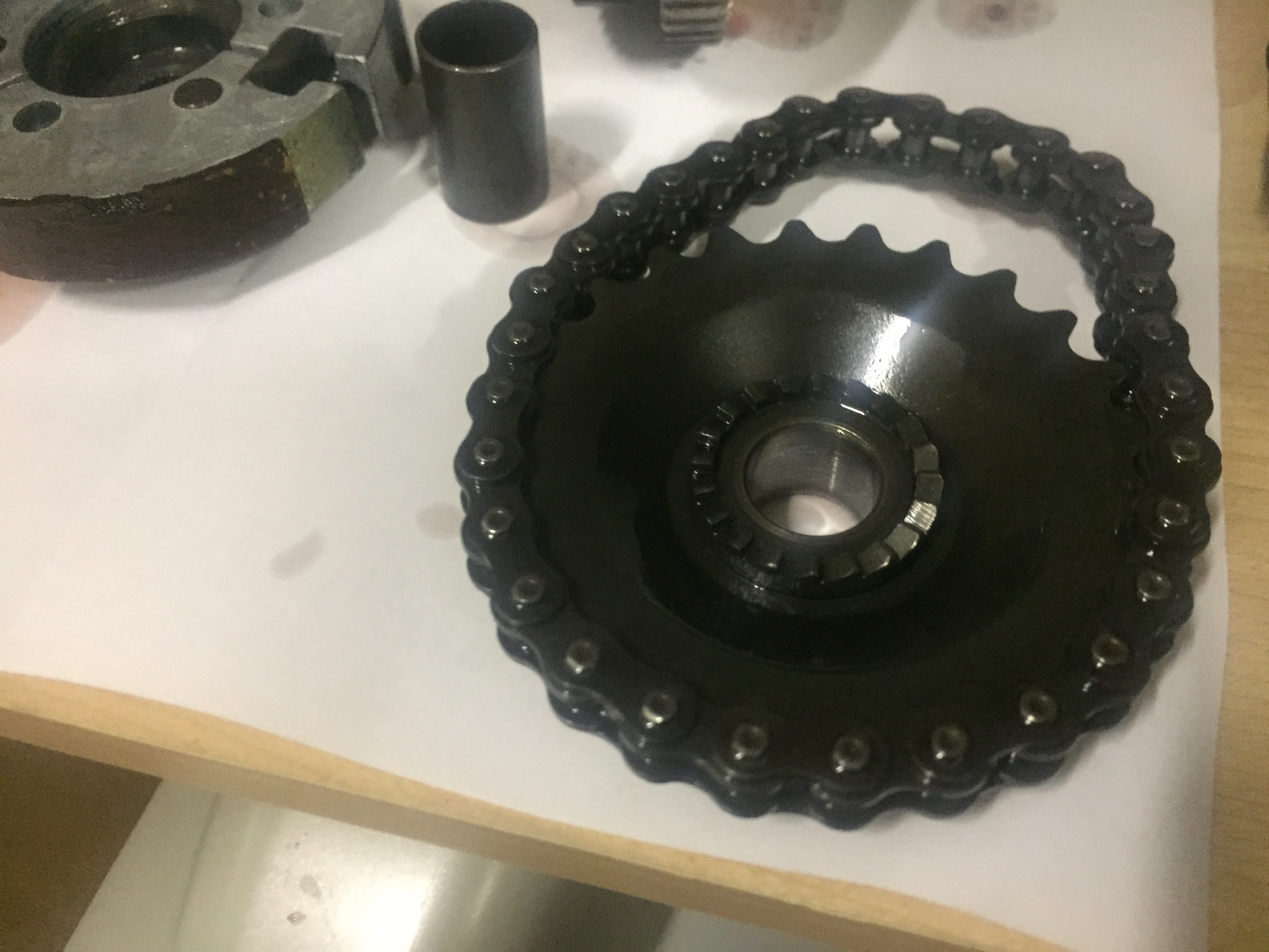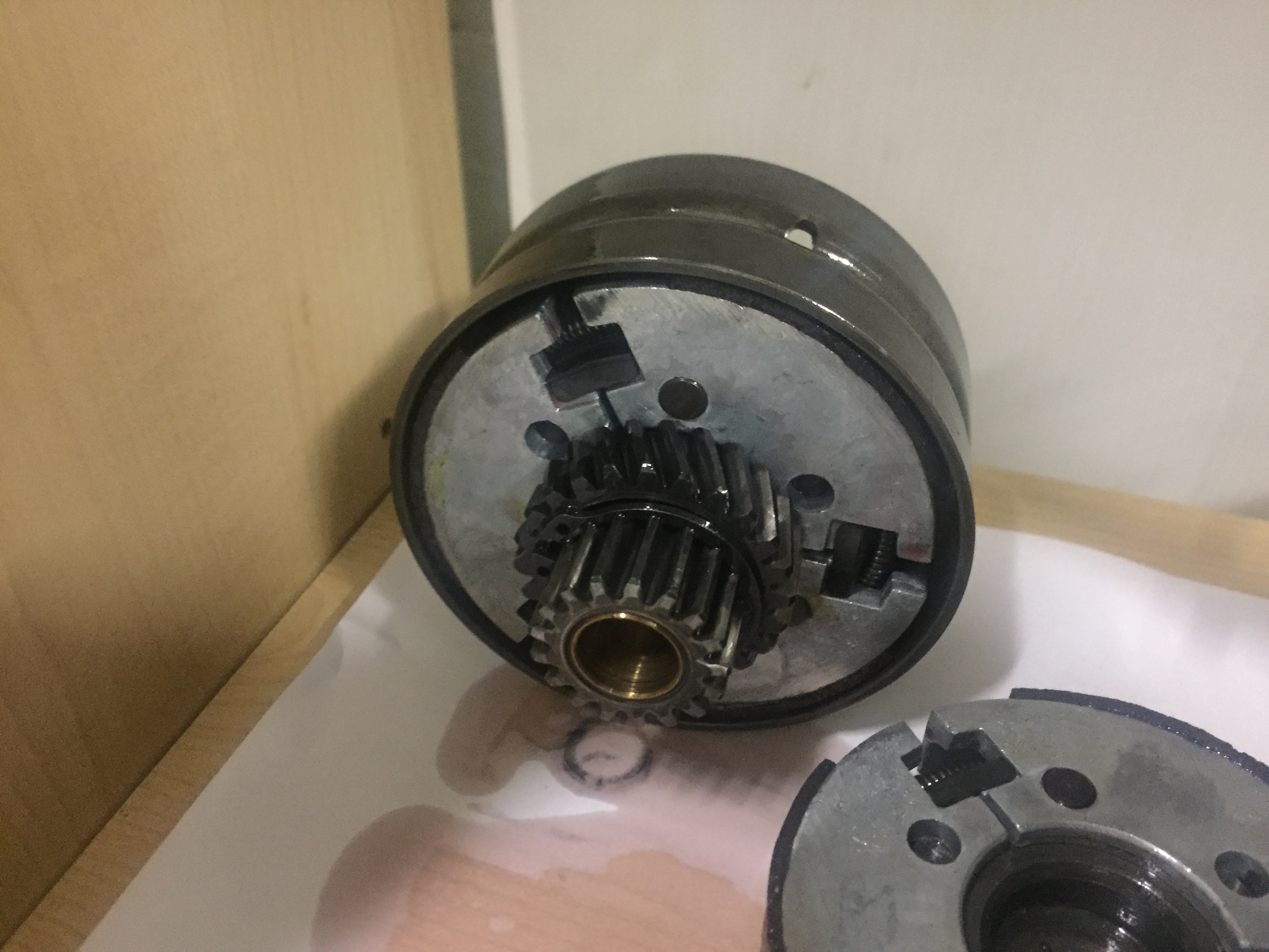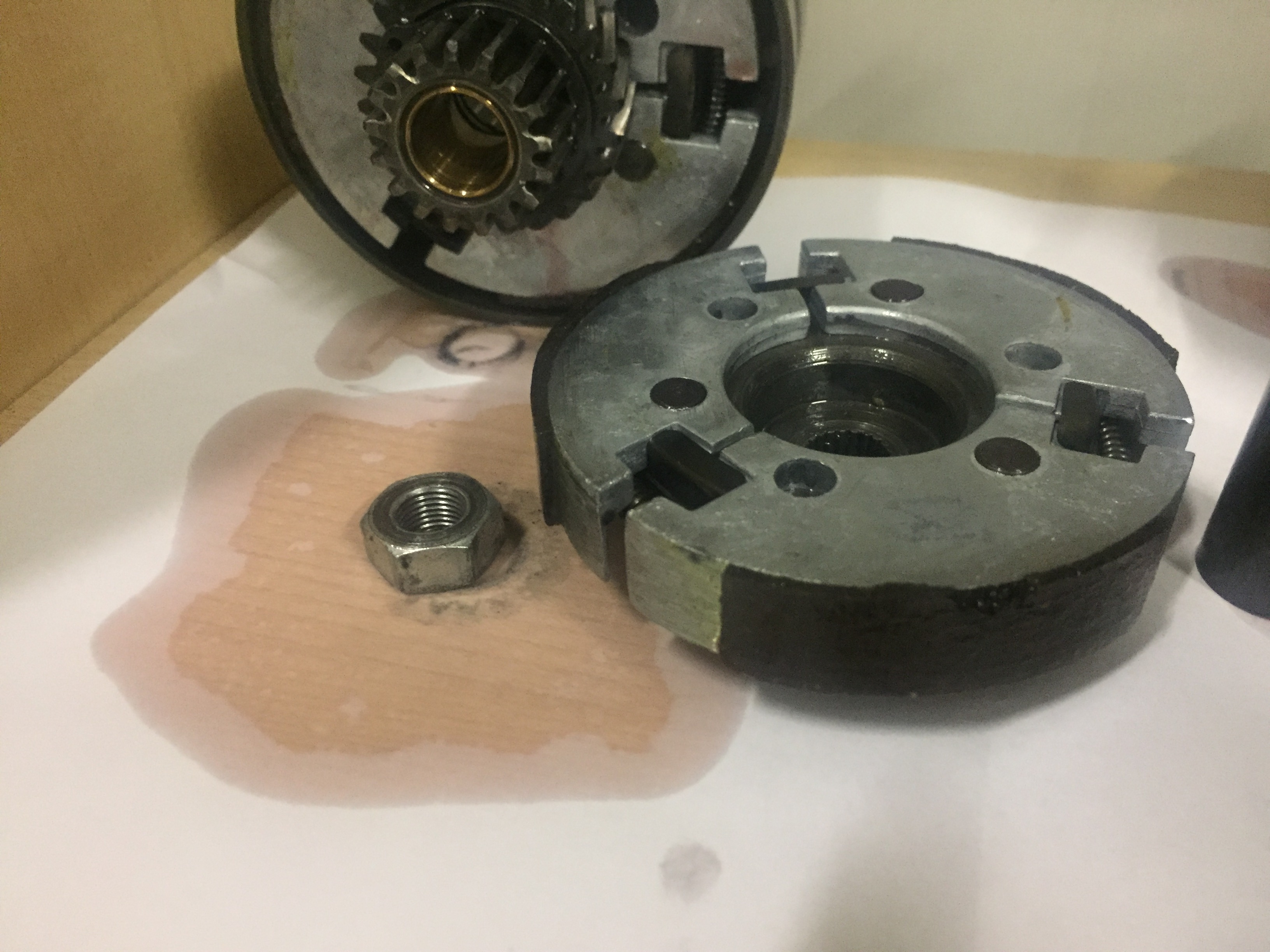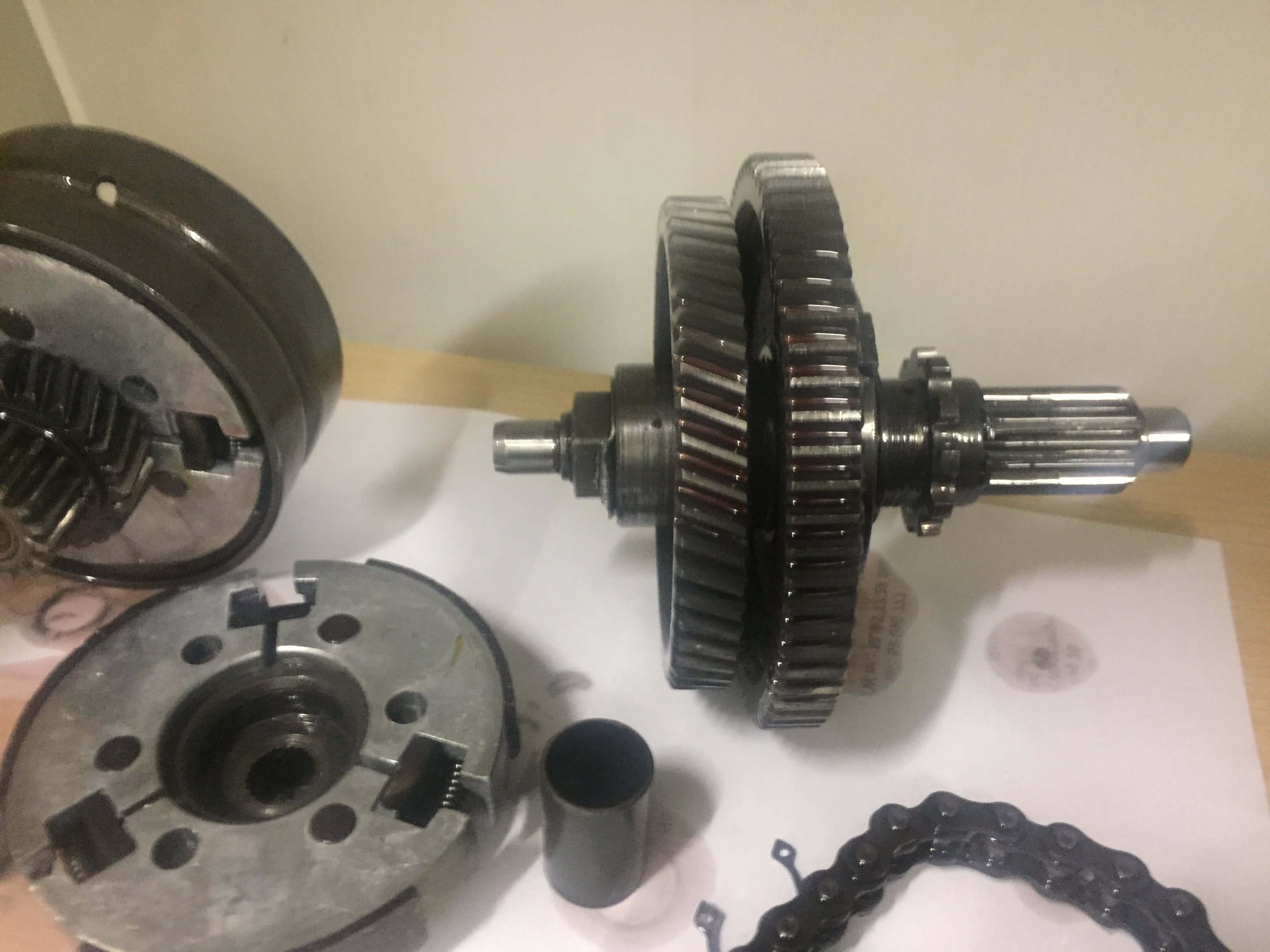 Normaal gesproken lopen alleen het grote tandwiel en de onderrand van het koppelingshuis door de olie. Die spetteren dat overal heen en uiteindelijk krijgt elk onderdeel voldoende smering. Is wat anders dan dat de koppeling door een bak olie moet ploegen. Dat geeft problemen.