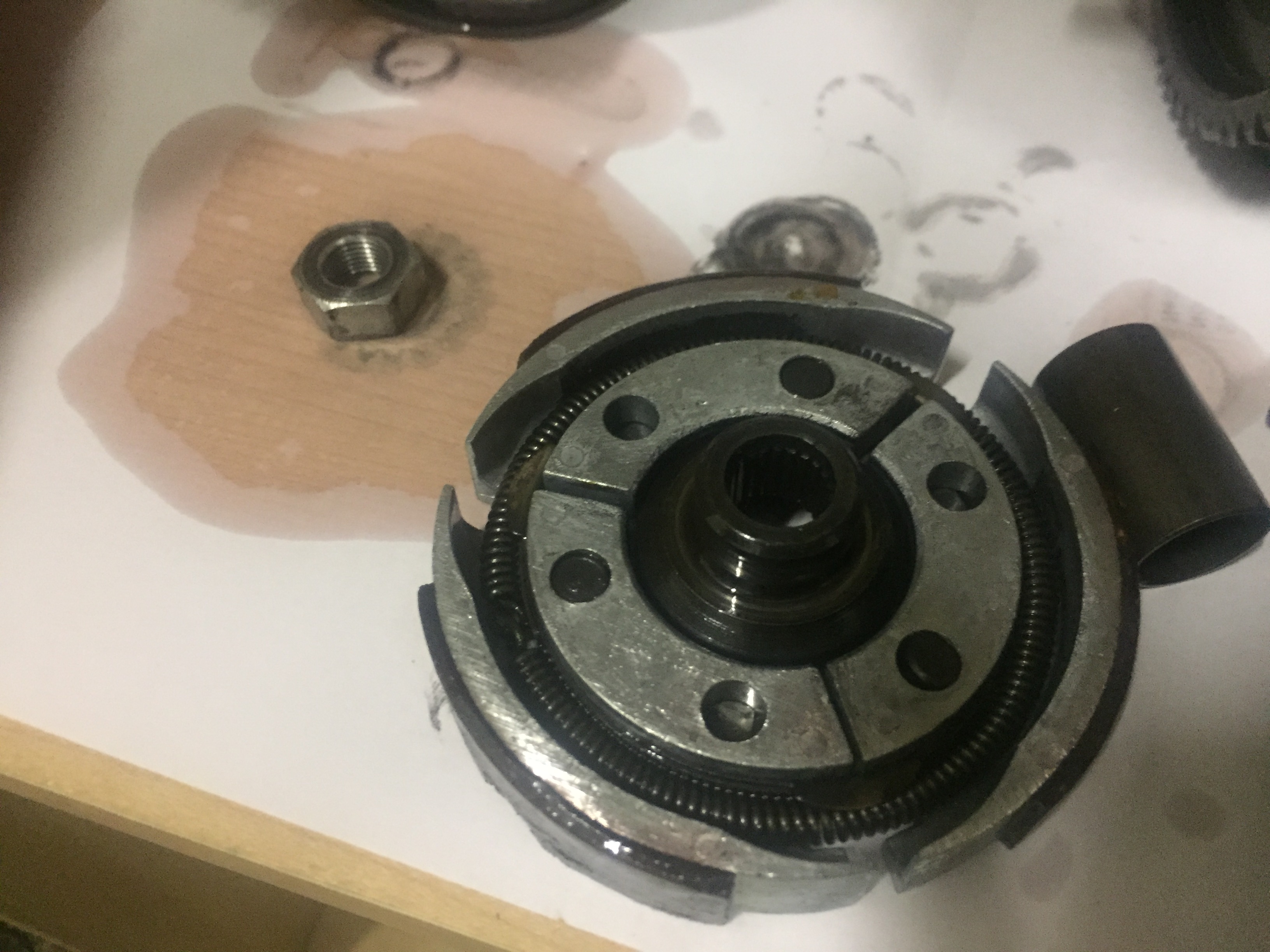 ik informeerde ernaar omdat ik een soort vloeistof zie op het papier waar de onderdelen op liggen. Is dit de olie die erin zat?
