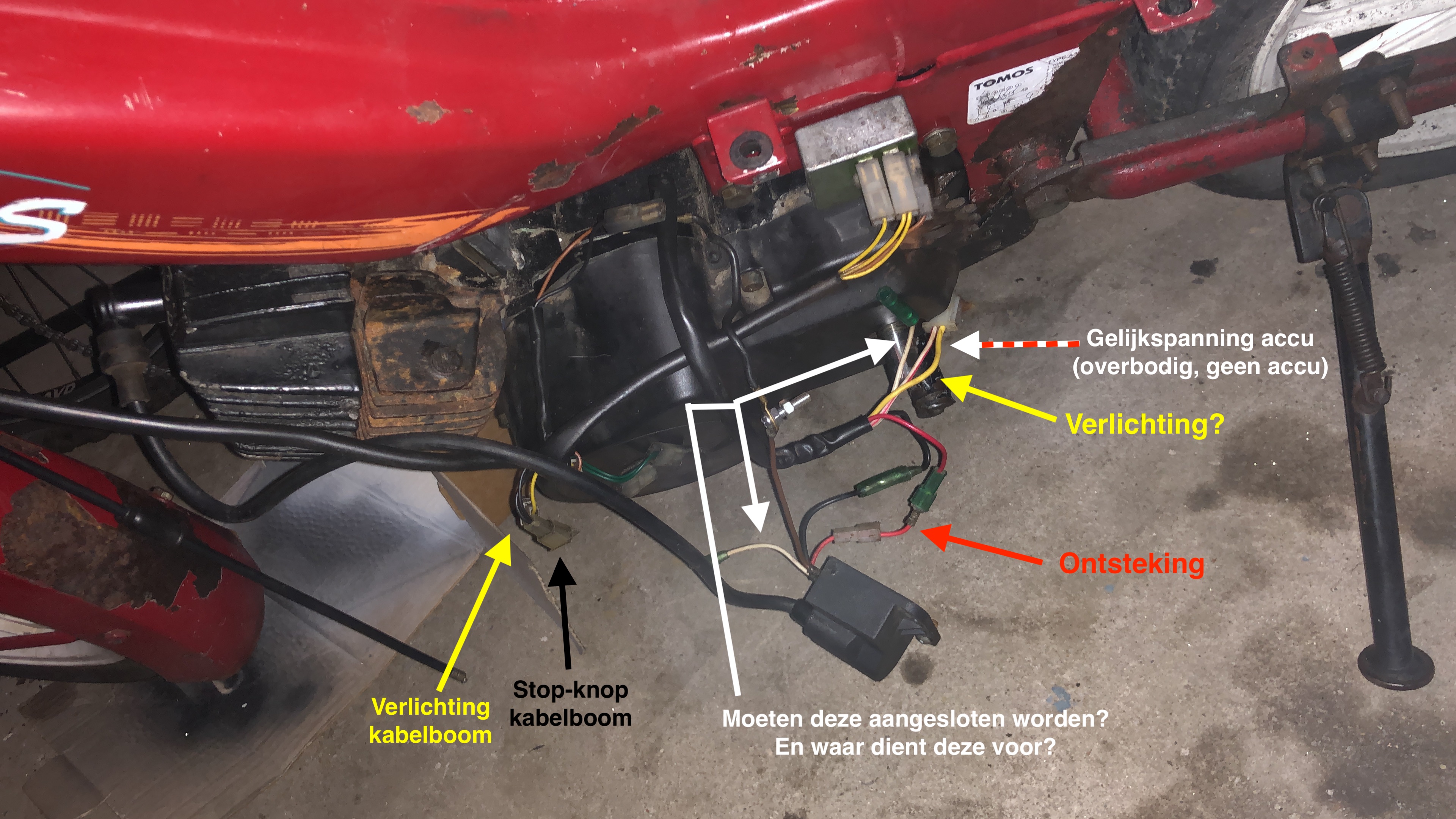 Top! Connector van de gele en rood-witte kabel afgeknipt, daarna de rood-witte kabel afgeplakt, een kabelschoentje op de gele gezet en aangesloten op de kabelboom. Daarba de rode kabels van de bobine aangesloten op de stopknop. Hij loopt meteen en de verlichting doet het, erg bedankt!