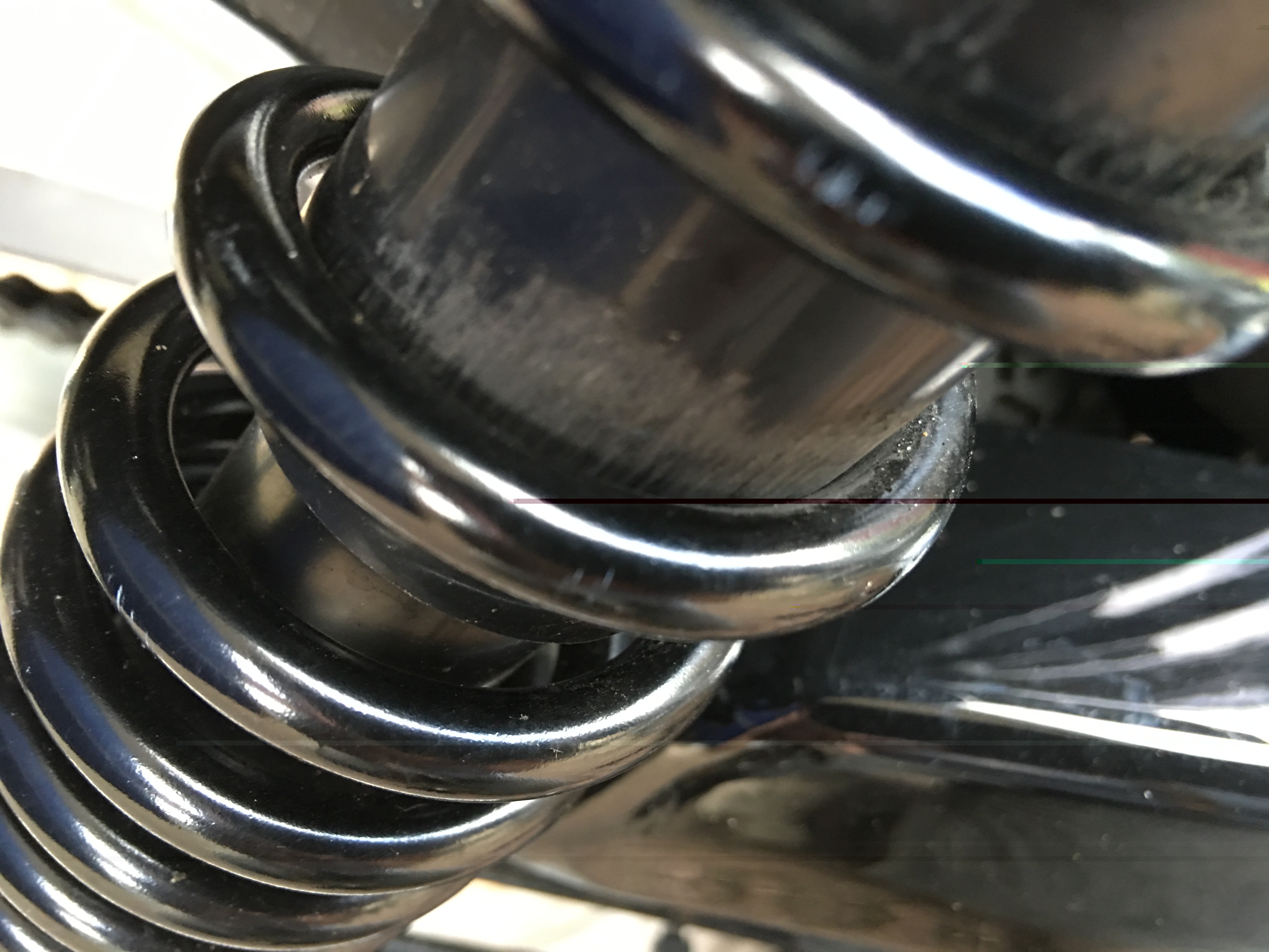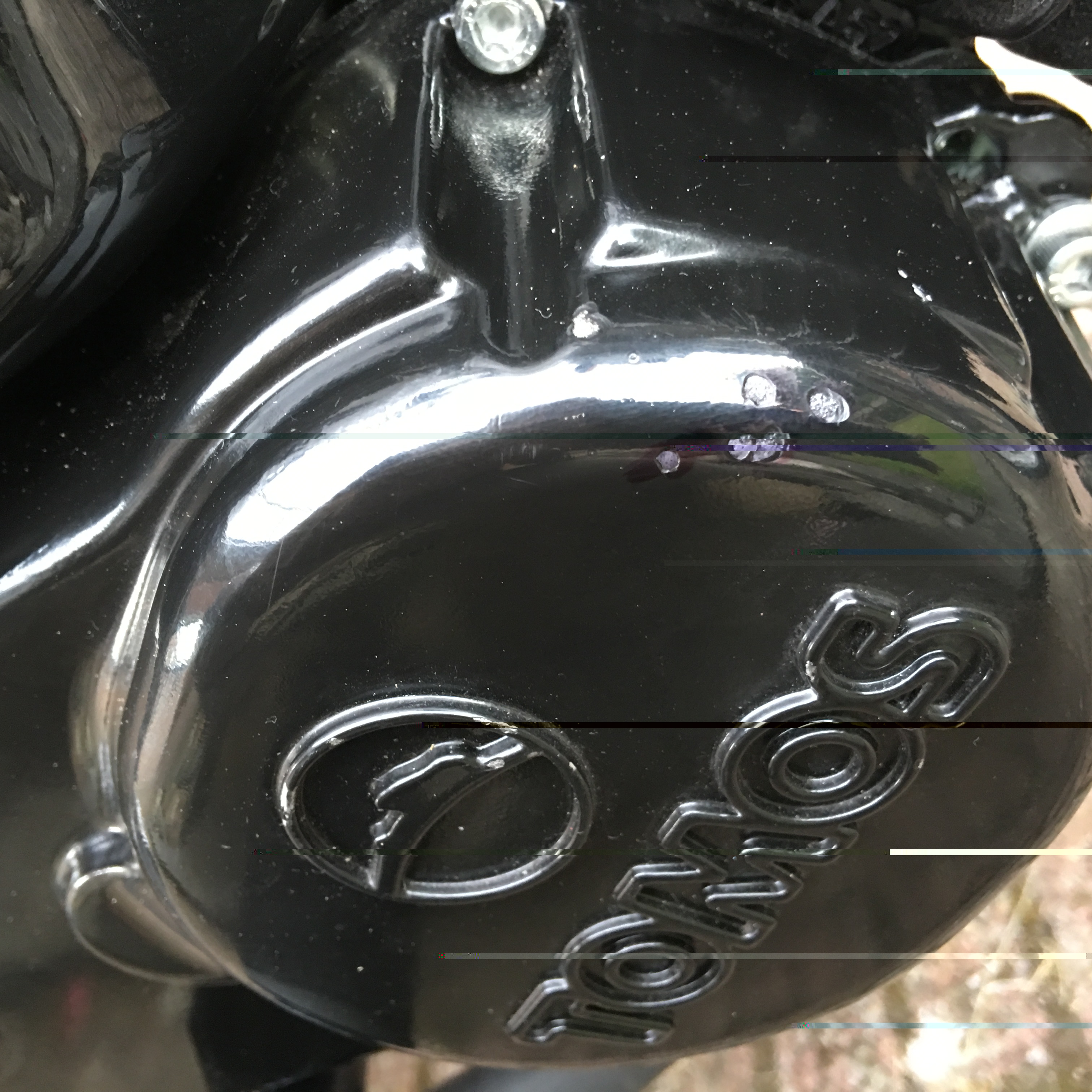 Tja, moet je van die beschadegingen zeggen, lijkt hier en daar wat steenslag, veer zit niet zo mooi gecentreerd dus krasjes, niet netjes. Beschadeging bij het wiel snap ik niet goed. Ketting spannen blijf je doen bij een tomos (ik iig wel)