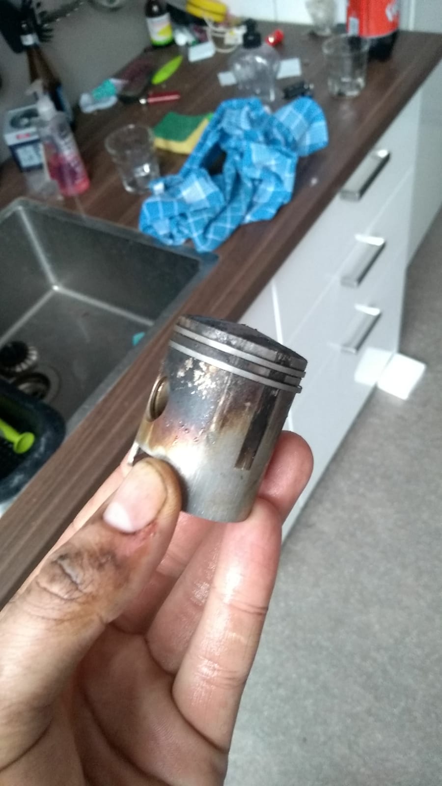 -Zuiger enorm verbrand aan de zijkanten en kool aanslag op de zuiger kop.