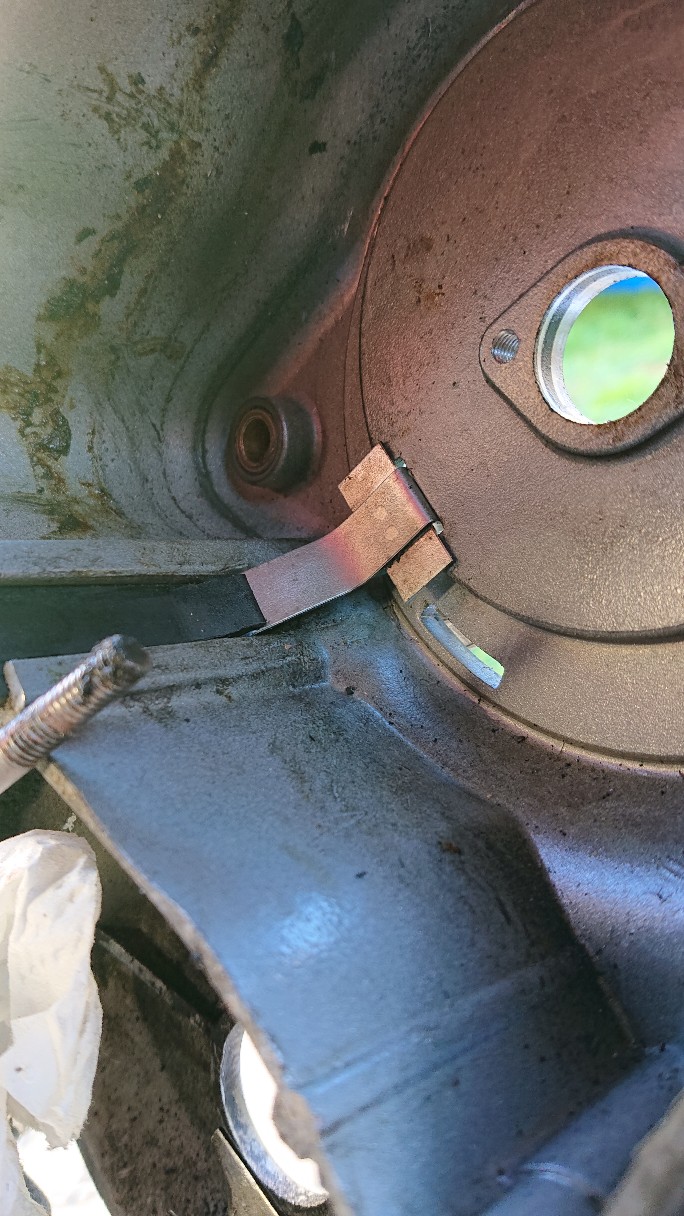 Wilde de voortandwiel vervangen. Had de tandwieldeksel voorzichtig eraf gehaald maar toen viel er een metaal gekleurd T vormig plaatje van zo 6cm uit. Het plaatje heeft van zichzelf, aan de T zijde, een gebogen vorm.