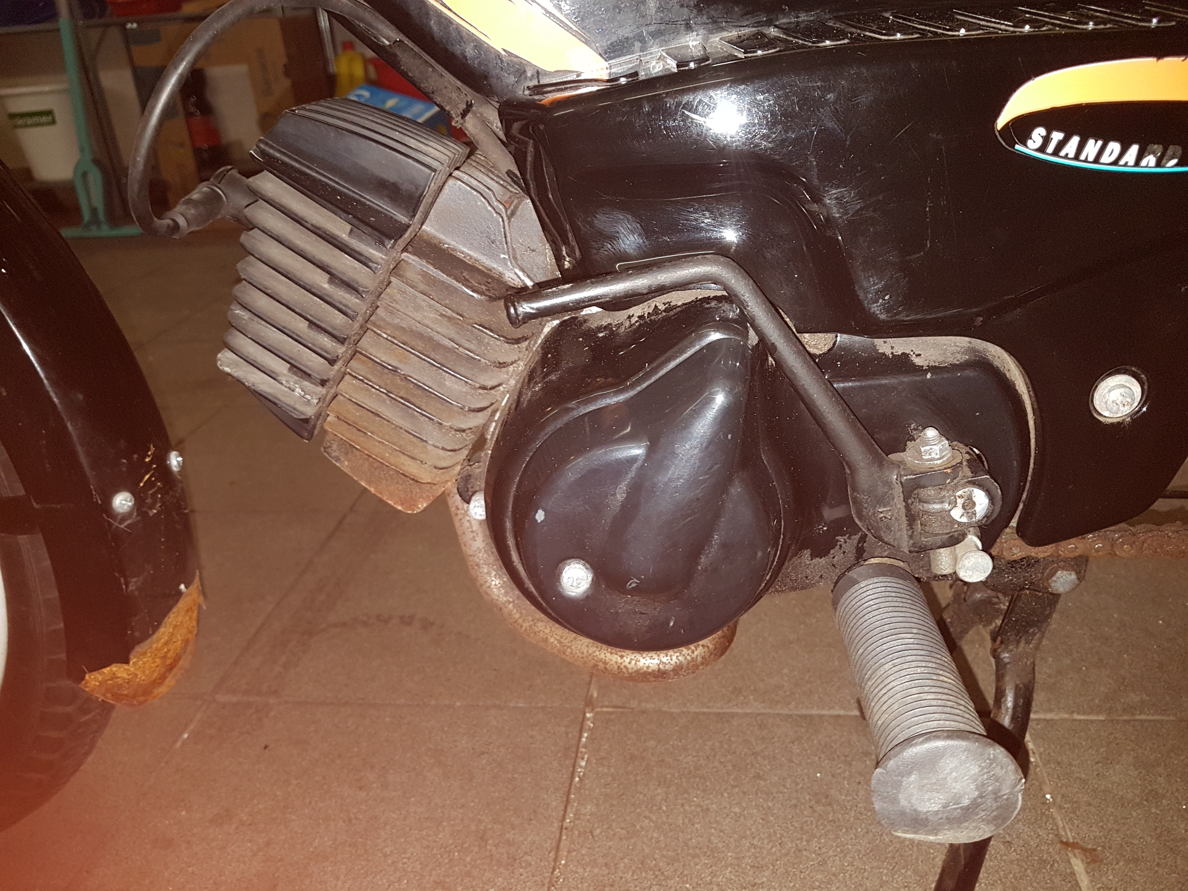 Vanavond heb ik eerst die lelijke koffer eraf gehaald en het ding eens gepoetst. Ik schrok eigenlijk hoe netjes dat Tomosje nog is. Ik heb wel gezien dat het voor en achterspatbord niet meer te redden zijn...die zal ik nog vervangen. Verder is er een stukje van de bagagedrager afgezaagd..dat hebben ze netjes afgewerkt met twee dopjes. Ook het kentekenplaatje zit niet netjes en is wat lelijk. DIe gaan we ook vervangen. Verder ga ik eens kijken wat er allemaal moet gebeuren voor een grote beurt.