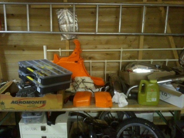 Vrijwel alles is gespoten, motorblok is gereviseerd, remklauw ben ik aan het reviseren en voorvork heb ik ook al gereviseerd. Ben nu bezig met opbouwen. Geweldig werk. Foto van hoe die er nu bij staat: