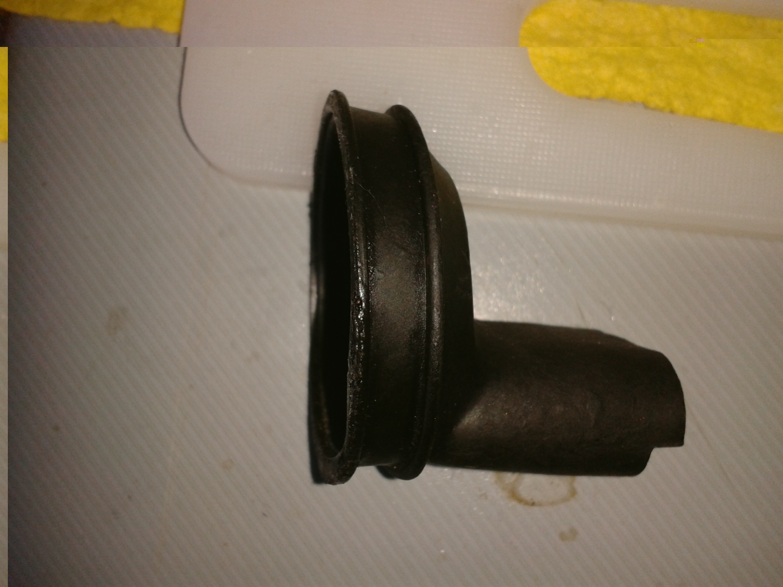 Dat rubberen stuk heb ik ook hier nog liggen alleen die is helemaal ingekrompen, waarschijnlijk heb jij dit ook waardoor niet meer goed past. Wat je kan proberen is het heel goed op te warmen in bijvoorbeeld warm water waardoor die weer flexibel wordt (betwijfel of dit nog werkt, materiaal is gewoon op denk ik.