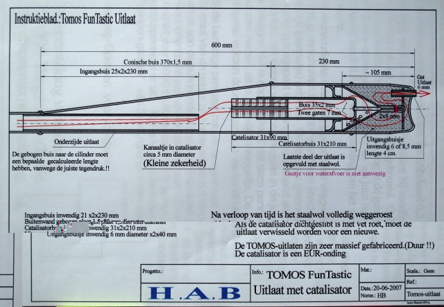 Het volgende mag je met een redelijk zakje zout nemen maar in principe zou er wel wat van te maken moeten zijn mits je demper aanpakt zodat ie een stuk minder restriktief is (gelijk aan 15 mm doorlaat), in hoeverre het dan nog een stil uitlaatje blijft valt te bezien. Dit is met bocht van 235 mm lengte. Net ff gekeken, 28 mm bocht zou precies goed zijn zodat je uitkomt met de beugel maar dan zit je op ongeveer 340 m lengte dus dan wordt ie laagtoeriger. Gelast worden moet er toch dus met die bochtlengte kan je spelen.