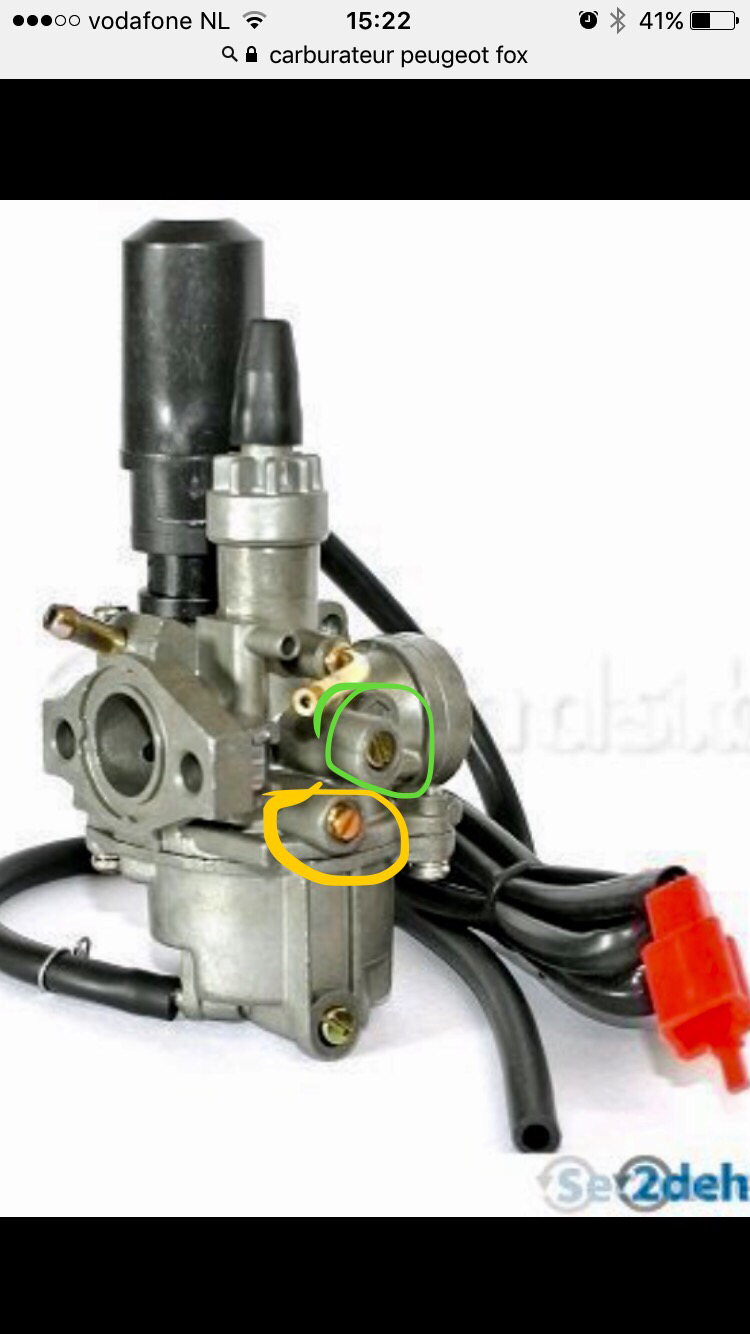 als het goed is heb je zo'n carburateur, de groene is de luchtschroef en de gele de stationairschroef.