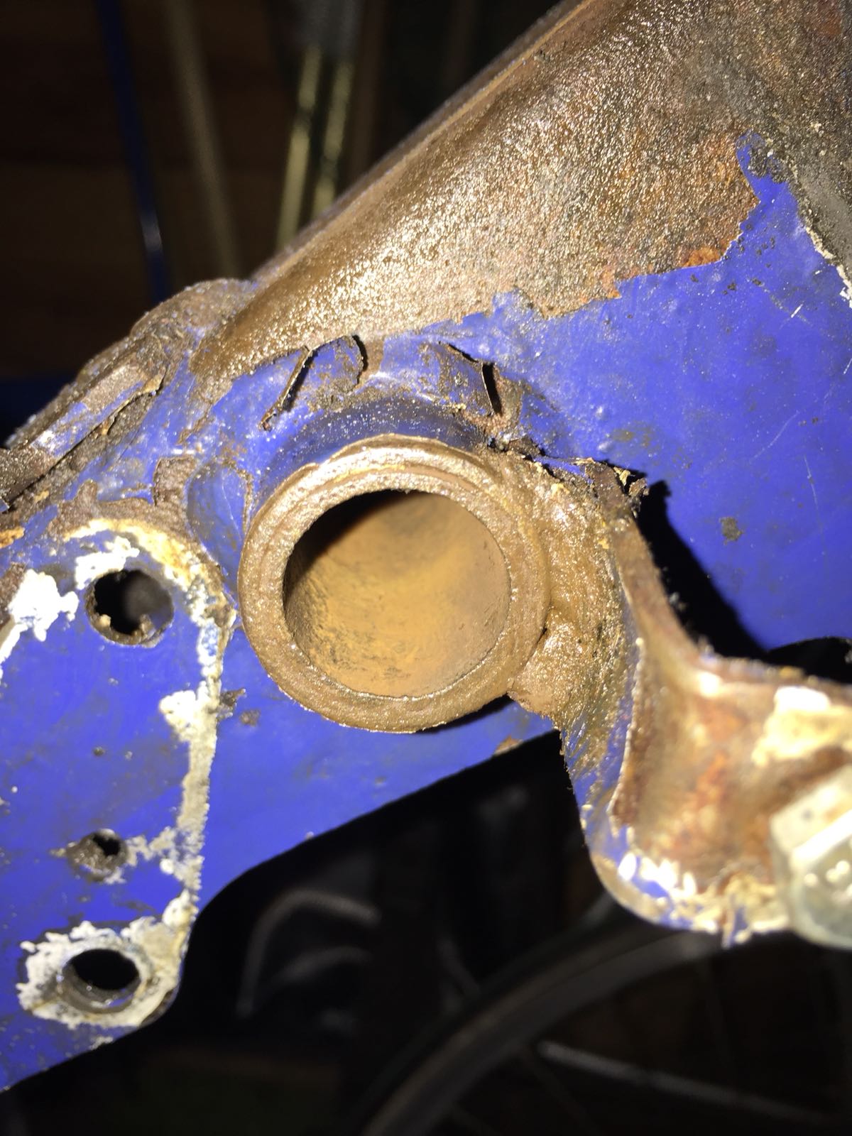 Zoals ik al aangeef en zichtbaar op bovenstaande foto, zijn de framebusjes net zo lang als de montageplaatsen in je frame. Die krijg je eruit als je met de nieuwe deze eruit perst. Tussen de schetsplaten van je frame is een holle ruimte, waar alleen de grote bus doorheen gaat.