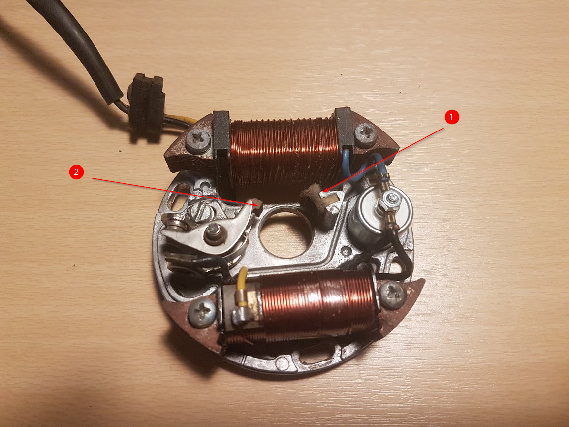 Het vliegwiel druk de punten open en dat deel moet mooi glad zijn anders slijt het fiber nokje van de punten erg snel, viltje in de grondplaat moet je oliën zodat hij het vliegwiel smeert en het zaakje niet roest.