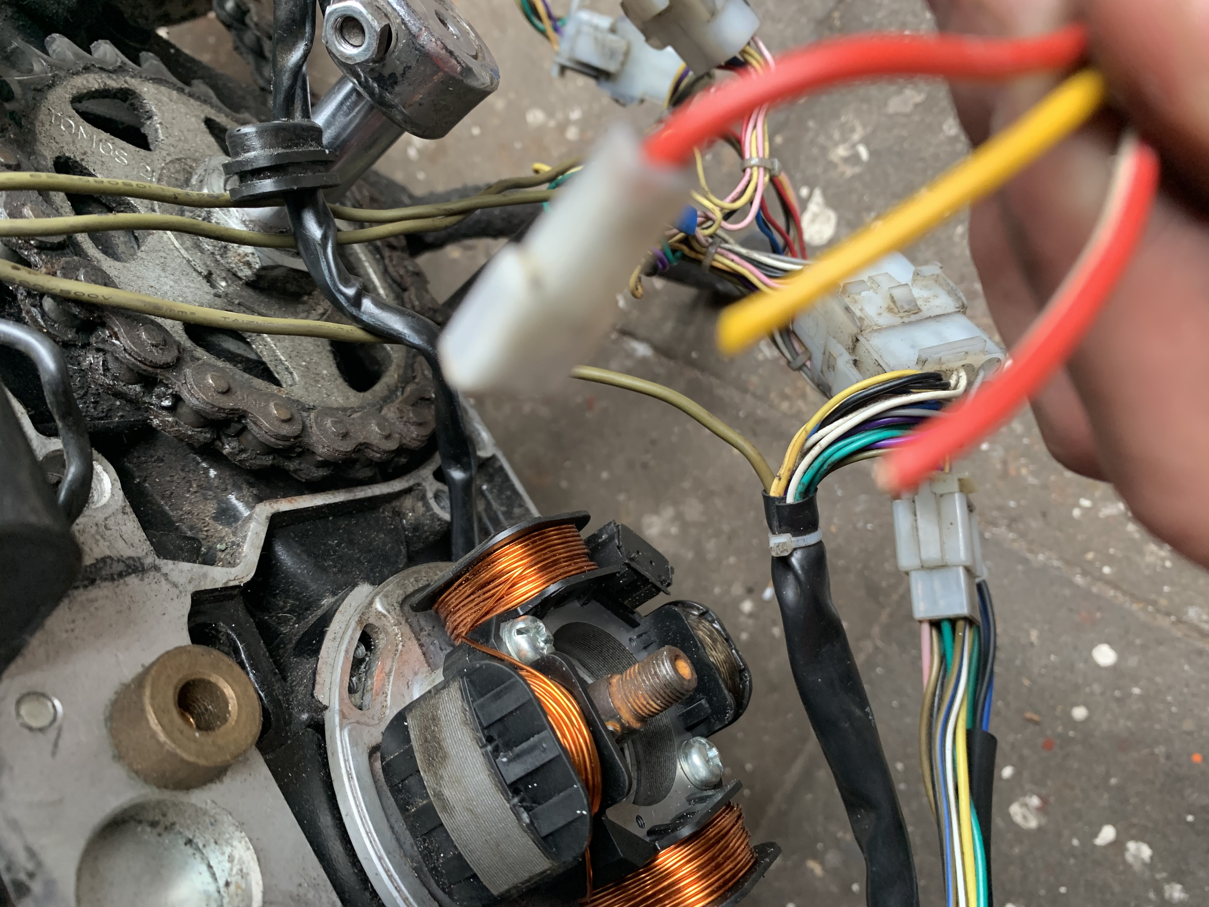 Jij hebt een rode met witte draad aan de ontsteking en die zit normaal op de spannings regelaar dc aansluiting...dat is voor modellen met accu....als je geen accu hebt kun je de draad afplakken.