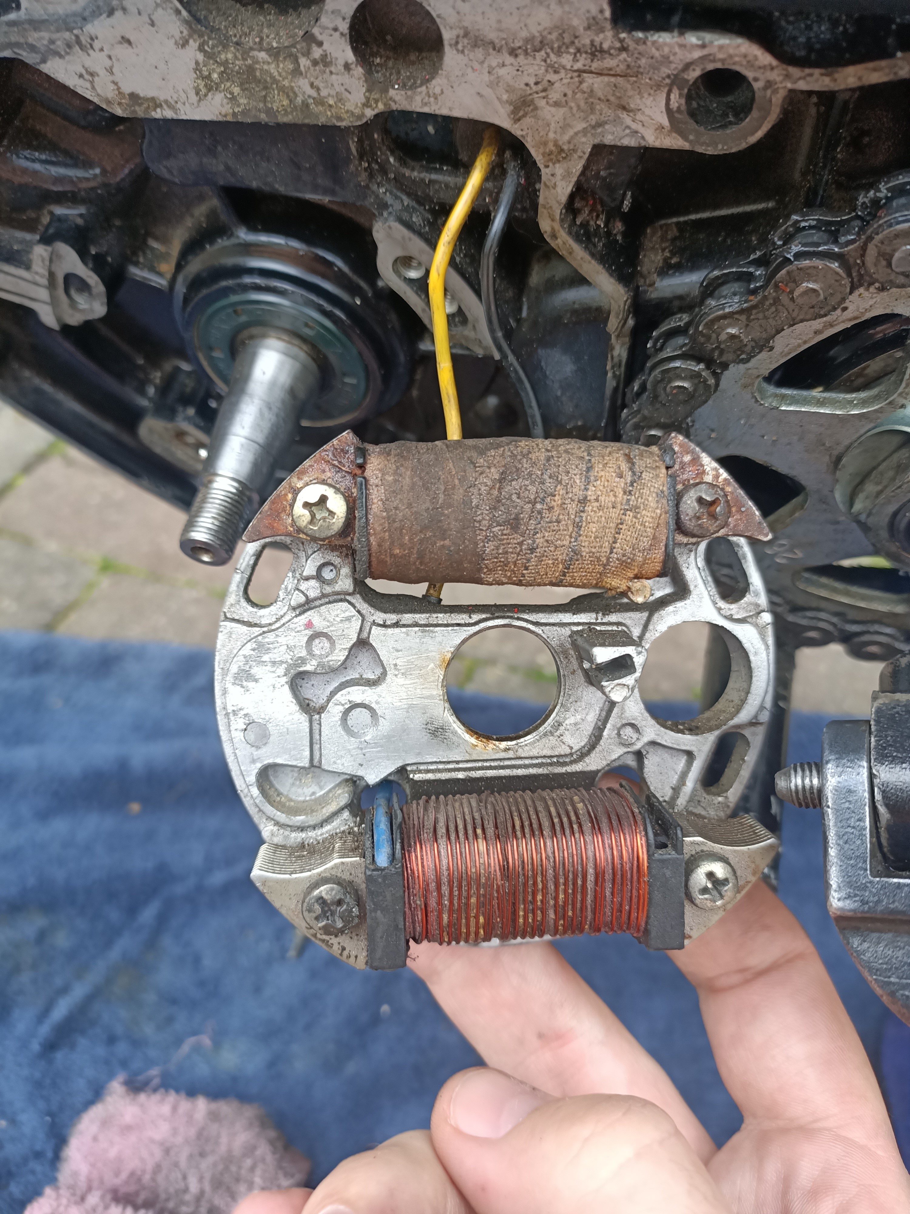 Ik heb inmiddels keerringen vervangen alles er weer op gezet. Nu start die bijna niet. Ook knalt die soms bij het kicken. Hij pakt wel aan en rookt even maar gaat gelijk weer uit. Nu wou ik de ontsteking nakijken. Ik heb een goede vonk maar vermoed dat de ontsteking niet goed is afgesteld. Welk type ontsteking is dit? En hoe is deze af te stellen? zie de bijlage voor een foto.