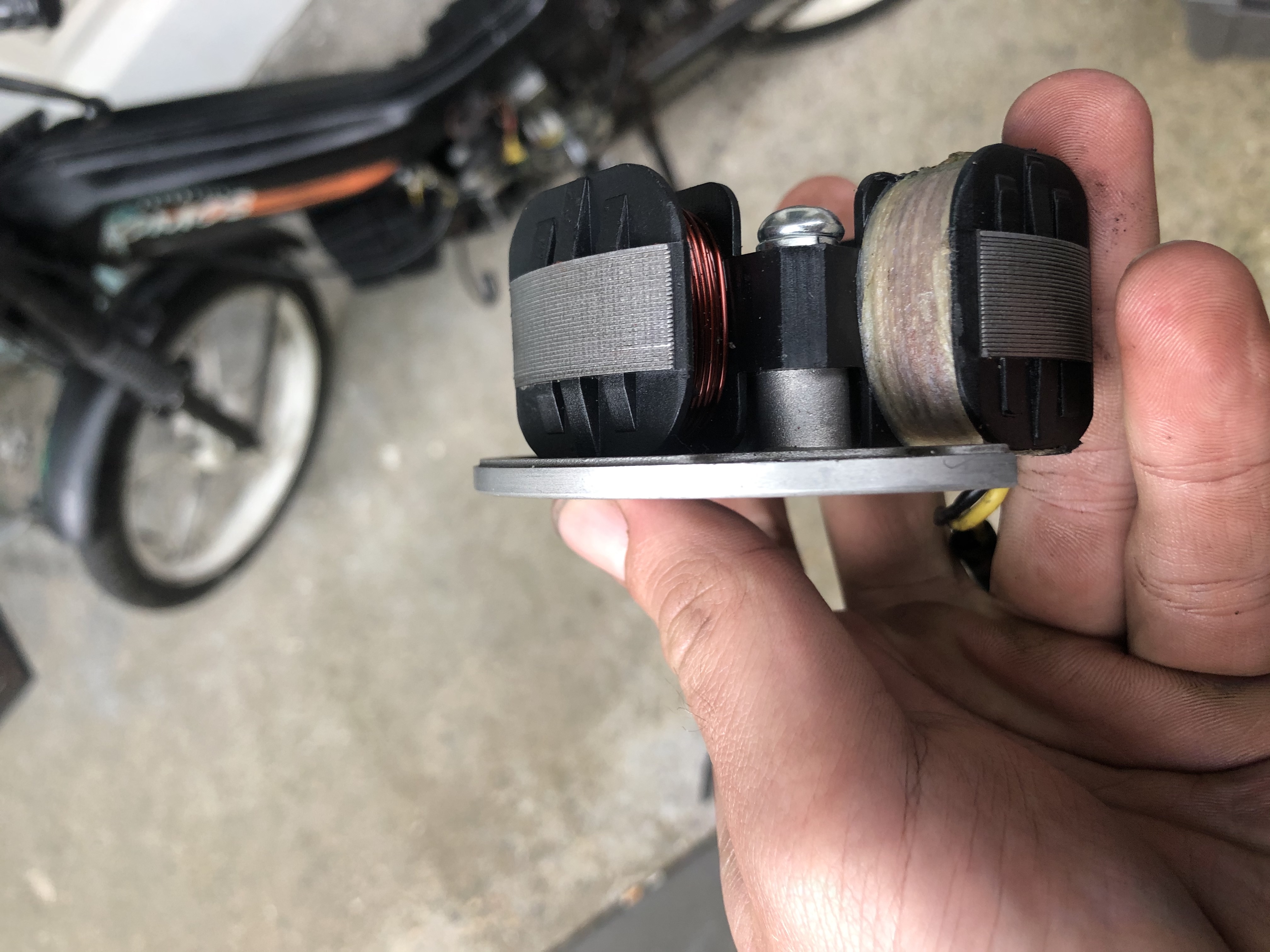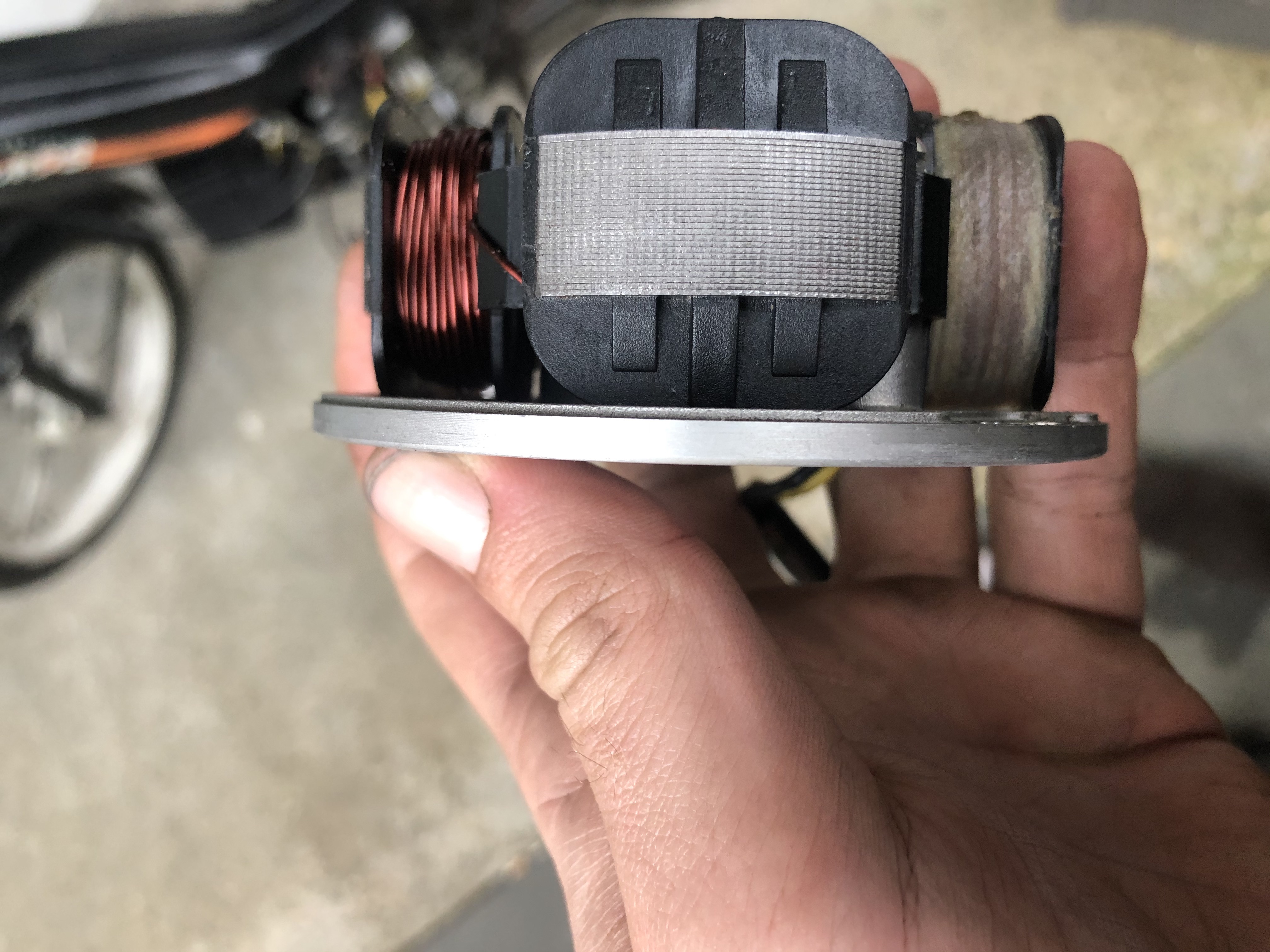 Dank voor jullie snelle reacties! Hierbij nog het vliegwiel. Ik heb alle settings voor de ontsteking geprobeerd, en bij alle was het resultaat hetzelfde; wiel draait achteruit en geen trekkracht van het wiel als deze op de grond staat.