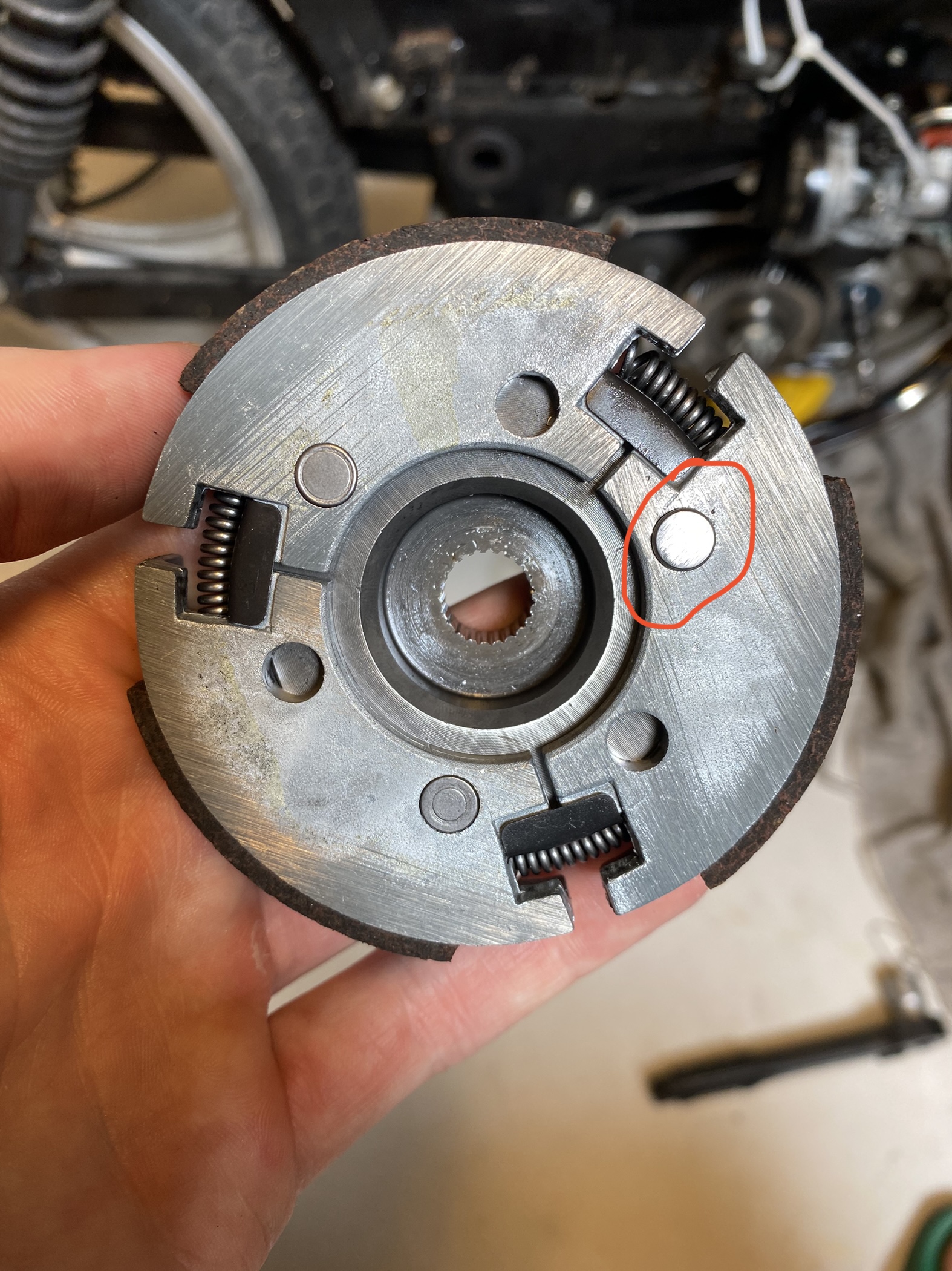 Voordat je hem loshaalt (je geeft aan ze niet los gehad te hebben) kun je ook kijken of er ruimte zit op het haltertje en de naaf van de koppeling. Het kan ook zijn dat het haltertje gebroken is. In sommige gevallen kun je het haltertje terugdrukken binnen de rand van het segment. Als je er voor kiest om de koppeling niet te demonteren maar de halter terug te drukken kun je het eerst in de gaten houden en als je dan geratel hoort tijdens het rijden weet je dat de binnenkant van je carter wordt geraakt en is het haltertje weer naar buiten is gekomen. Op dat moment niet verder rijden en de motor inmiddelijk stoppen!