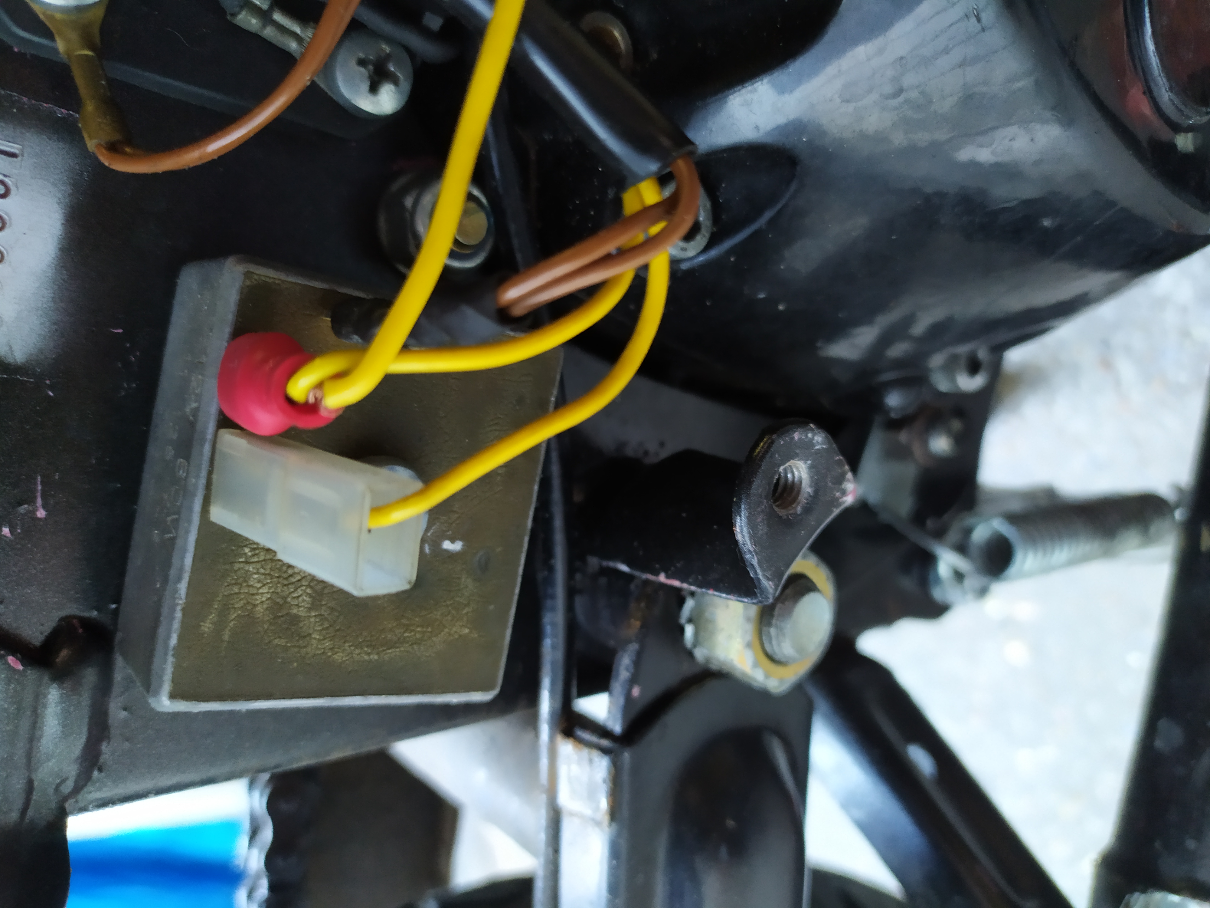 Als ik het goed heb gaat een dubbel geel vanaf de regelaar naar het balhoofd achter de koplamp. Daar wordt de draad gesplits in 1 draad naar je blokje op het stuur en de andere voor accessoires (o.a. toeter) die los hangt achter je koplamp. Dit is ook de dubbel geel die in de zwarte mantel zit. Zie foto in de cirkel en de rode pijlen. Dit is de dubbel gele draad en hoort in 1 stekker.